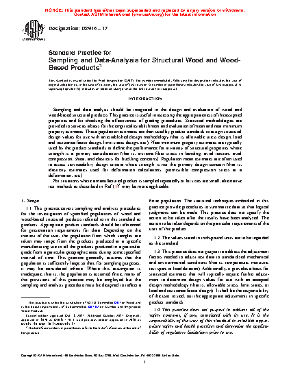 1.1 This practice covers sampling and analysis procedures for the investigation of specified populations of wood and wood-based structural products referred to in this standard as products. Appropriate product standards should be referenced for presentation requirements for data. Depending on the interest of the user, the population from which samples are taken may range from the products produced at a specific manufacturing site to all the products produced in a particular grade from a particular geographic area, during some specified interval of time. This practice generally assumes that the population is sufficiently large so that, for sampling purposes, it may be considered infinite. Where this assumption is inadequate, that is, the population is assumed finite, many of the provisions of this practice may be employed but the sampling and analysis procedure must be designed to reflect a finite population. The statistical techniques embodied in this practice provide procedures to summarize data so that logical judgments can be made. This practice does not specify the action to be taken after the results have been analyzed. The action to be taken depends on the particular requirements of the user of the product.