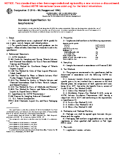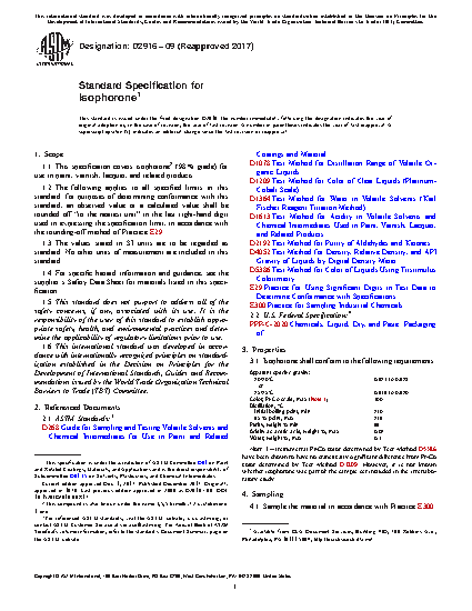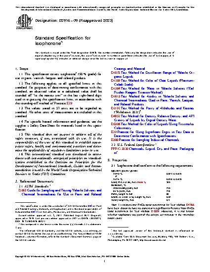 1.1 This specification covers isophorone2 (98 % grade) for use in paint, varnish, lacquer, and related products.