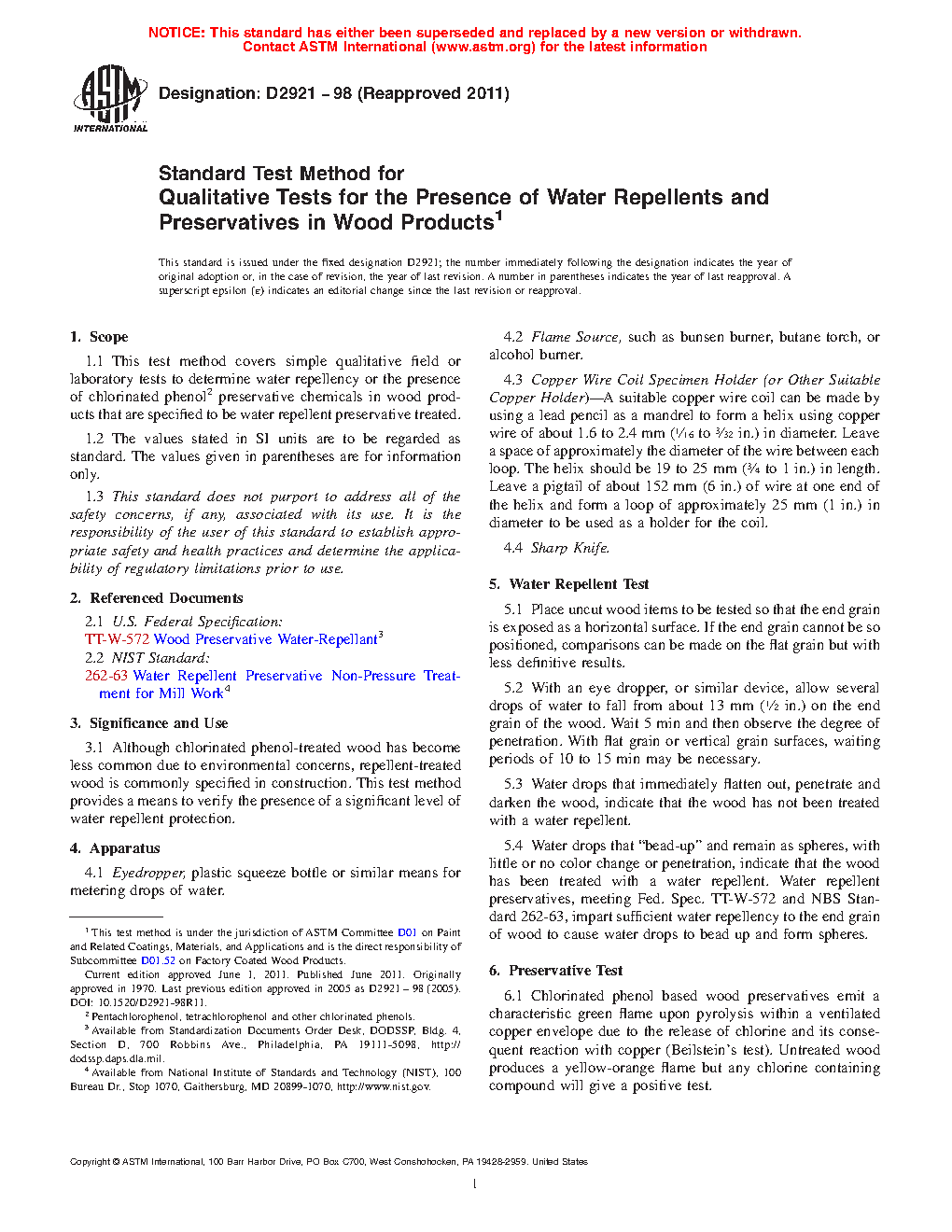 1.1 This test method covers simple qualitative field or laboratory tests to determine water repellency or the presence of chlorinated phenol2 preservative chemicals in wood products that are specified to be water repellent preservative treated.