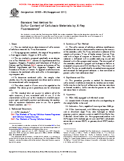 4.1 This procedure provides a method for determining sulfur content in cellulosic materials by nondestructive means. Sulfur may be in the form of sulfate esters that may contribute to thermal instability. Sulfur can also be present as salts that can cause haze in solutions.