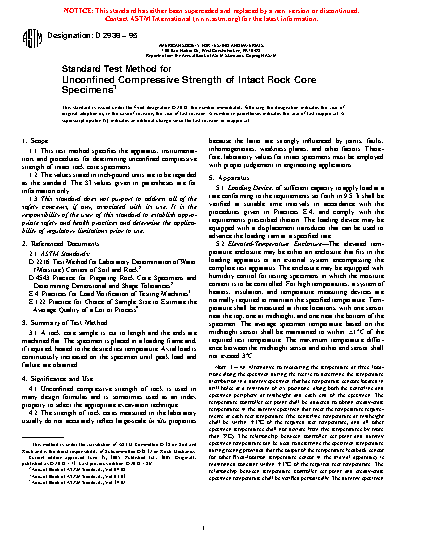 1.1 This test method specifies the apparatus, instrumentation, and procedures for determining unconfined compressive strength of intact rock core specimens.