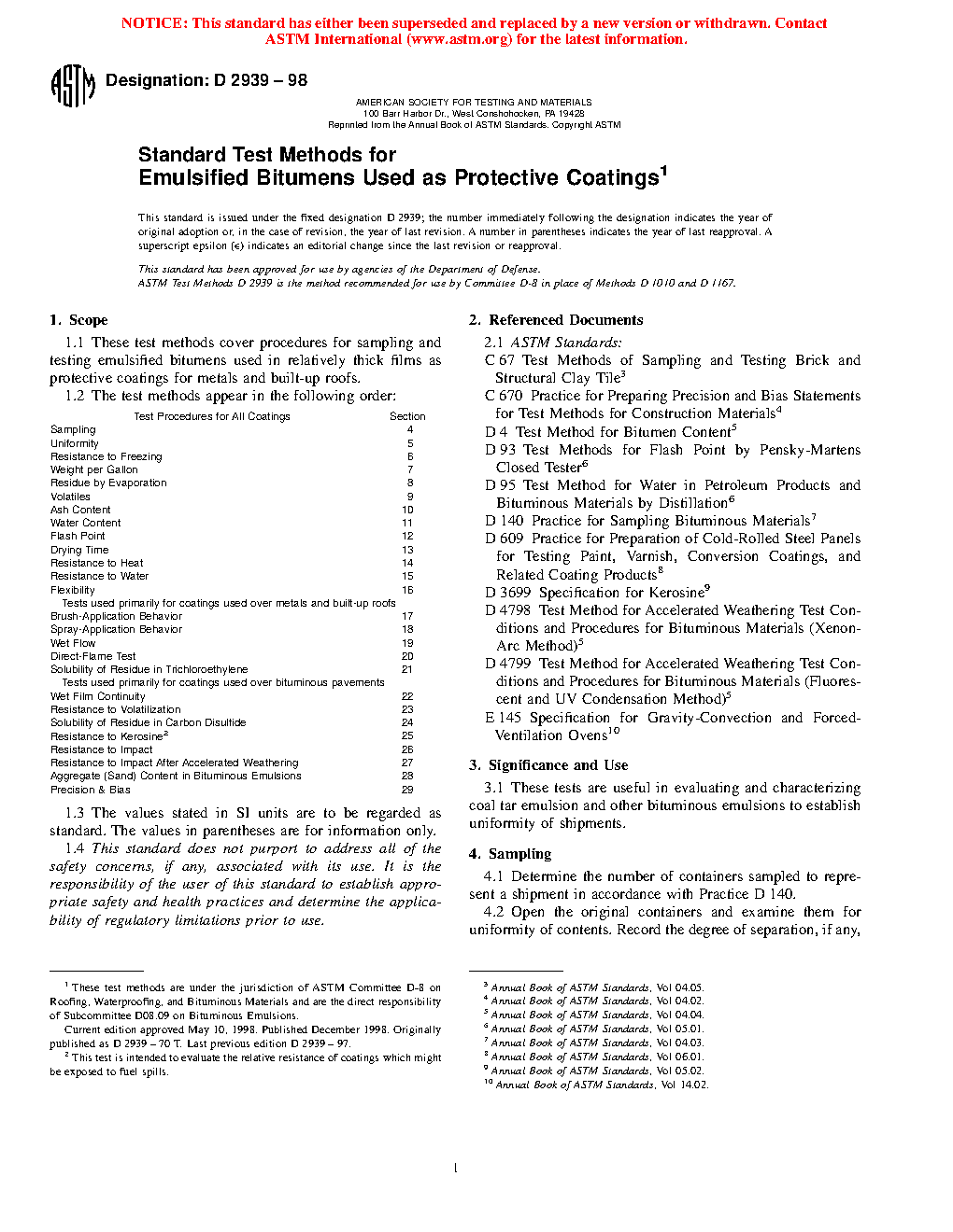 1.1 These test methods cover procedures for sampling and testing emulsified bitumens used in relatively thick films as protective coatings for metals, built-up roofs, and bituminous pavements.