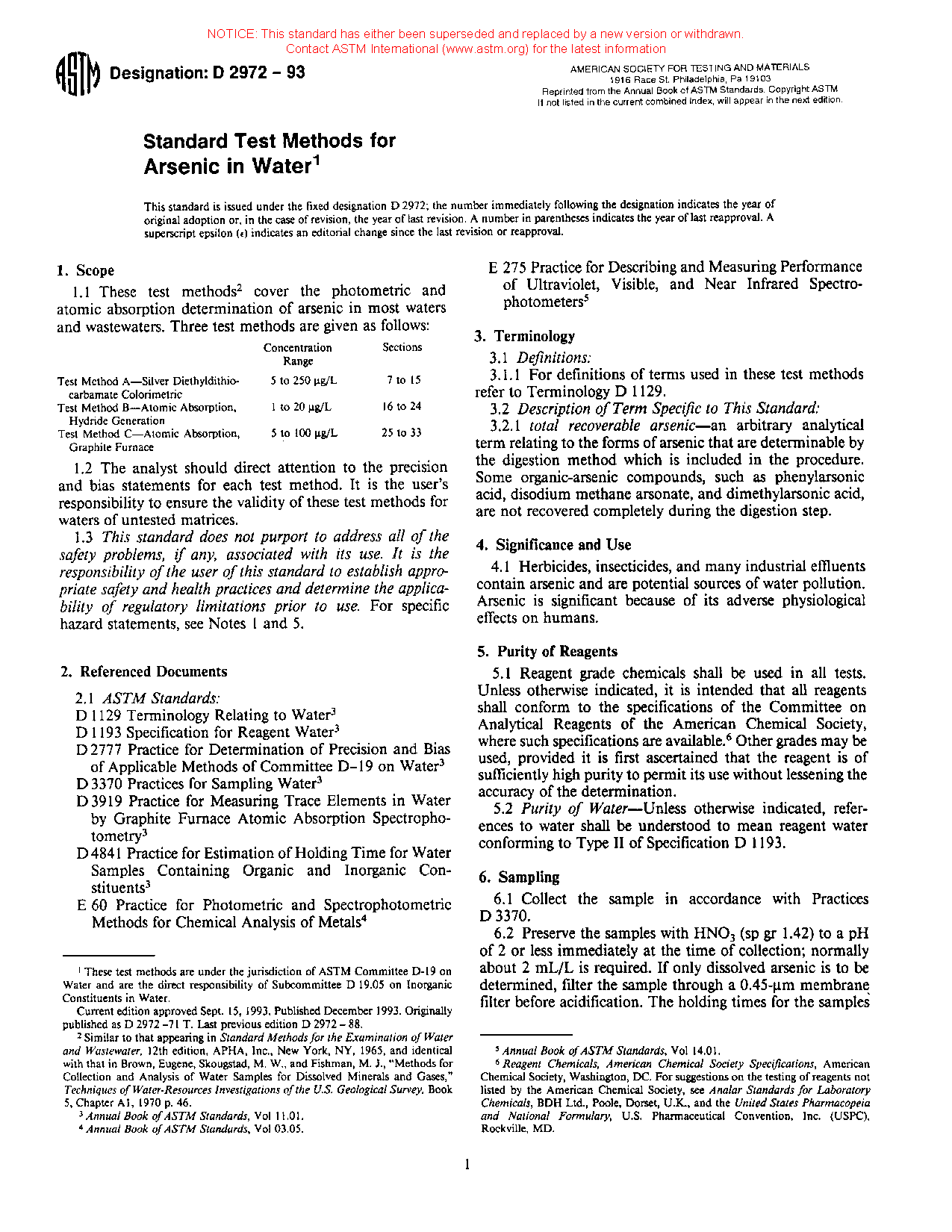 1.1 These test methods2 cover the photometric and atomic absorption determination of arsenic in most waters and wastewaters. Three test methods are given as follows:
