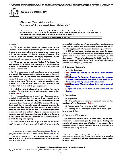1.1 This test method covers the measurement of the volume of uncompressed (loose) and compressed (baled) peat and peat-based growing media and is used as a quality control measurement to determine if the package contains the labeled amount of material. The results of this test method is highly dependent on the experience of the personnel running the procedure.