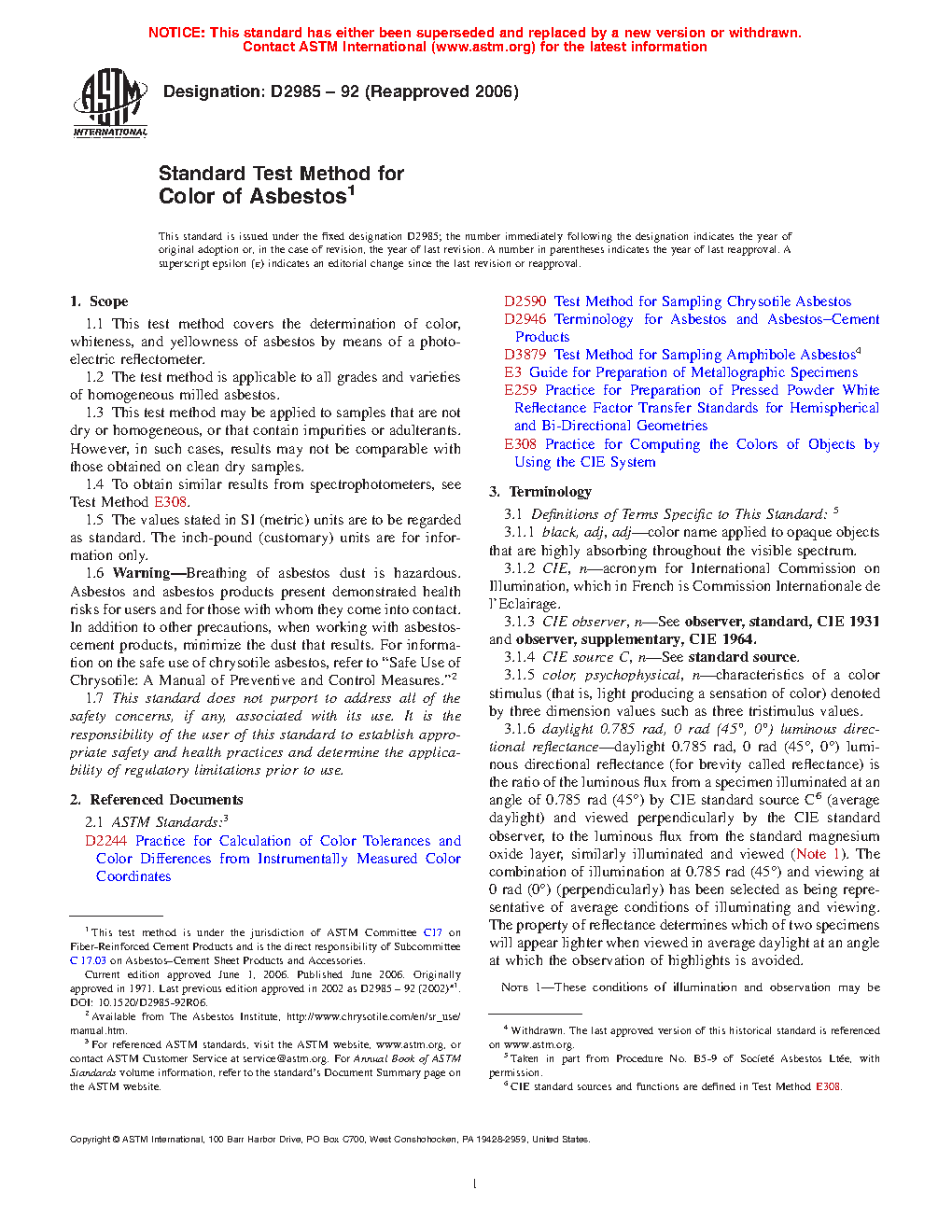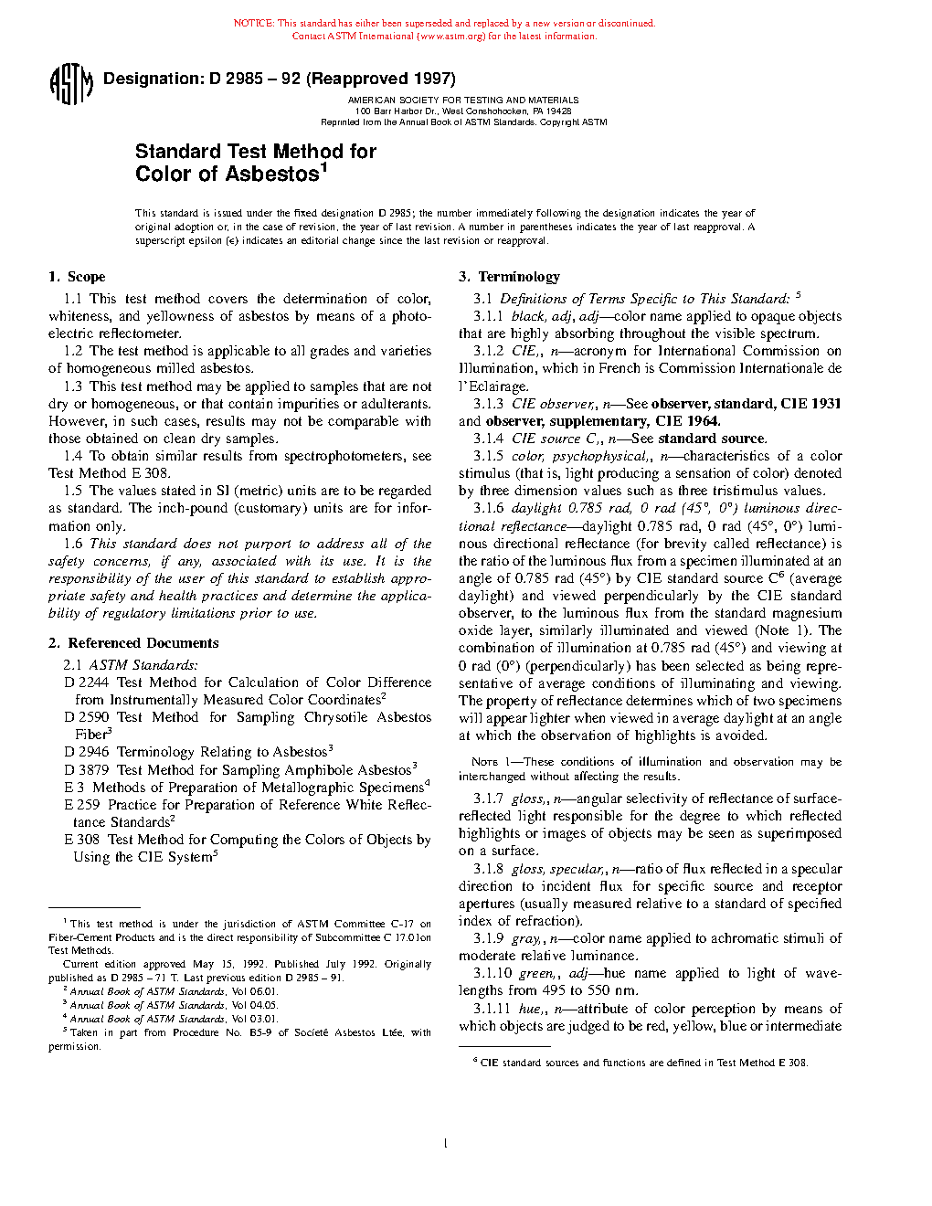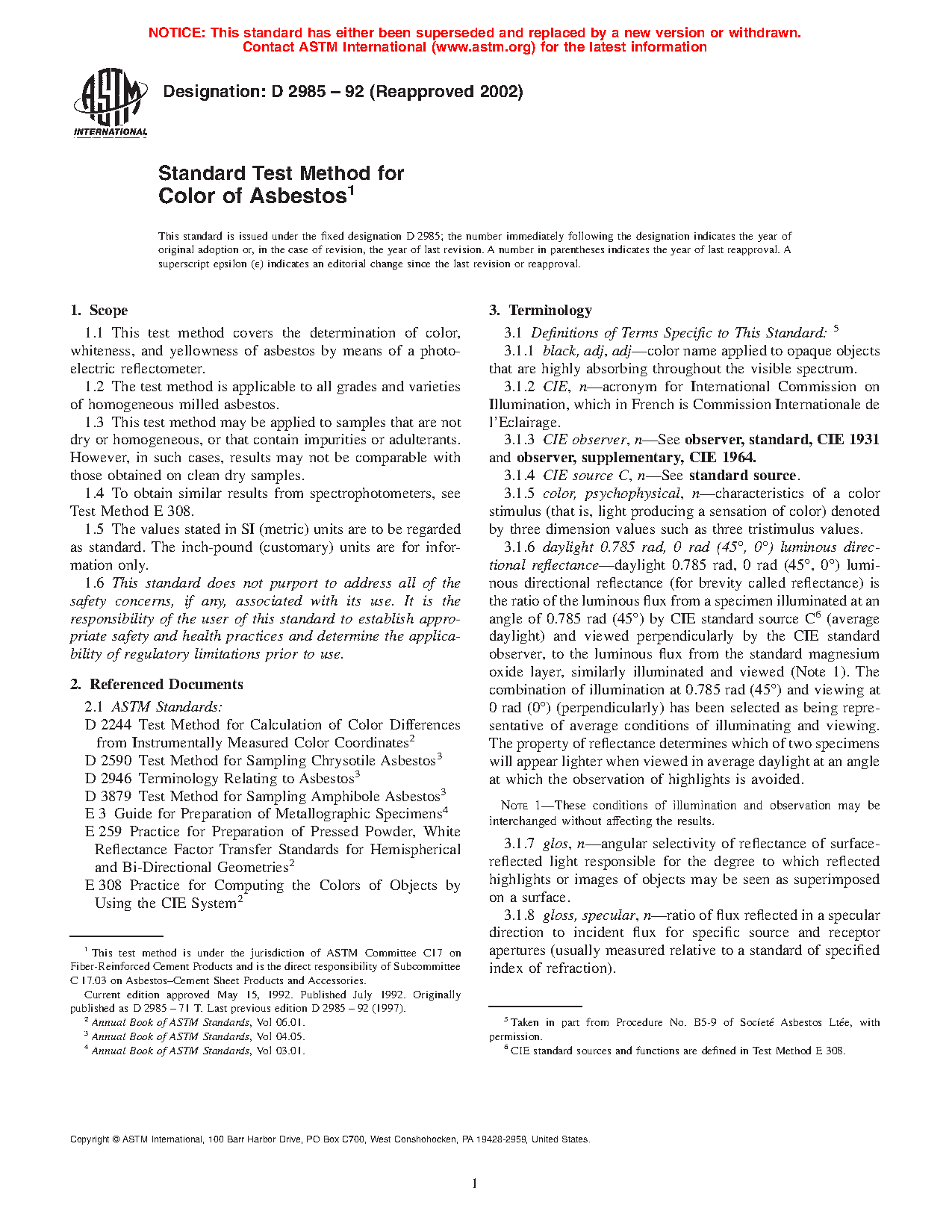 1.1 This test method covers the determination of color, whiteness, and yellowness of asbestos by means of a photoelectric reflectometer.