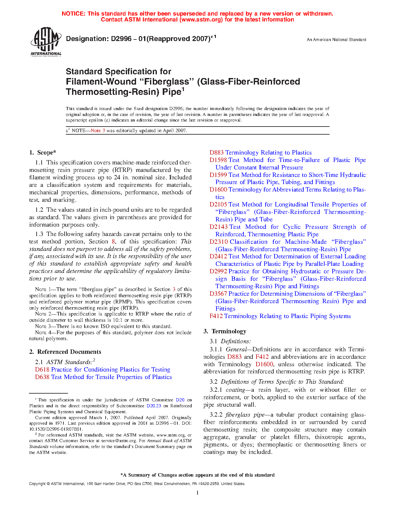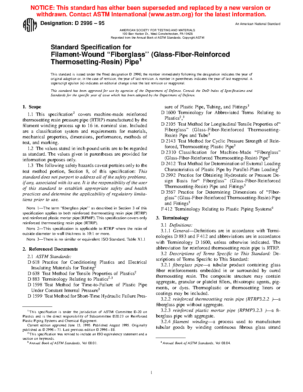Note 1—The term "fiberglass pipe" as described in Section 3 of this specification applies to both reinforced thermosetting resin pipe (RTRP) and reinforced plastic mortar pipe (RPMP). This specification covers only reinforced thermosetting resin pipe (RTRP).