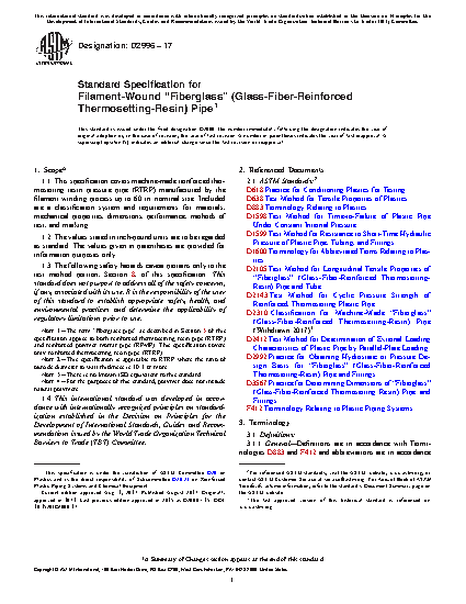 1.1 This specification covers machine-made reinforced thermosetting resin pressure pipe (RTRP) manufactured by the filament winding process up to 24 in. nominal size. Included are a classification system and requirements for materials, mechanical properties, dimensions, performance, methods of test, and marking.