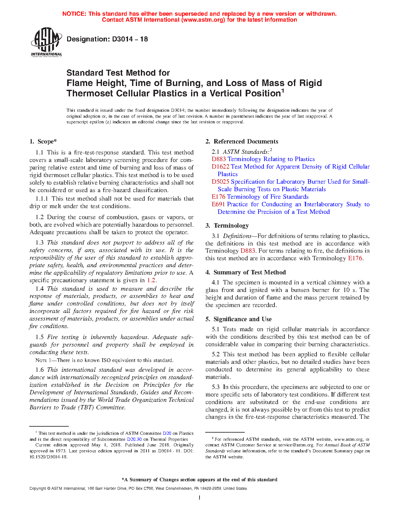 1.1 This is a fire-test-response standard. This test method covers a small-scale laboratory screening procedure for comparing relative extent and time of burning and loss of mass of rigid thermoset cellular plastics. This test method is to be used solely to establish relative burning characteristics.