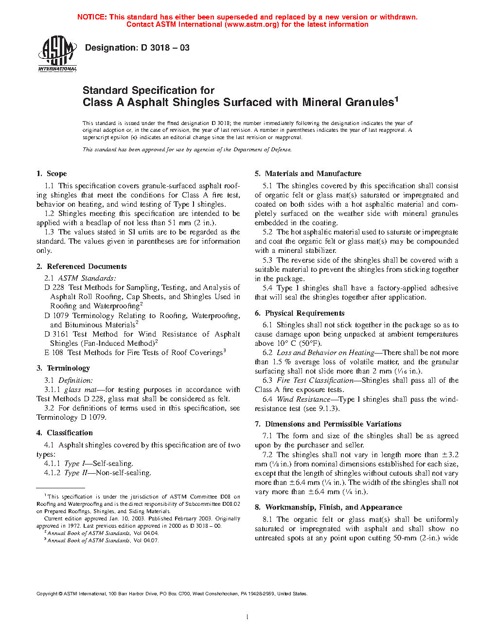 1.1 This specification covers granule-surfaced asphalt roofing shingles that meet the conditions for Class A fire test, behavior on heating, and wind testing of Type I shingles.