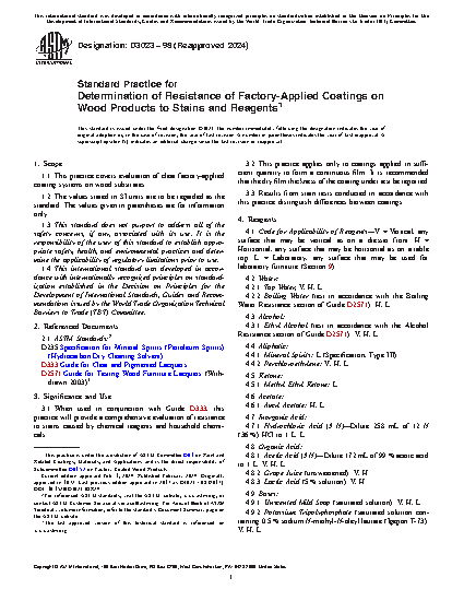 3.1 When used in conjunction with Guide D333, this practice will provide a comprehensive evaluation of resistance to stains caused by chemical reagents and household chemicals.