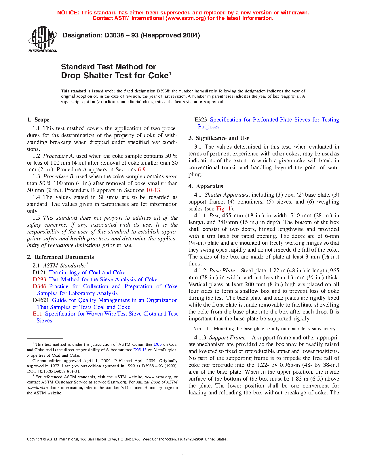 3.1 The values determined in this test, when evaluated in terms of pertinent experience with other cokes, may be used as indications of the extent to which a given coke will break in conventional transit and handling beyond the point of sampling.