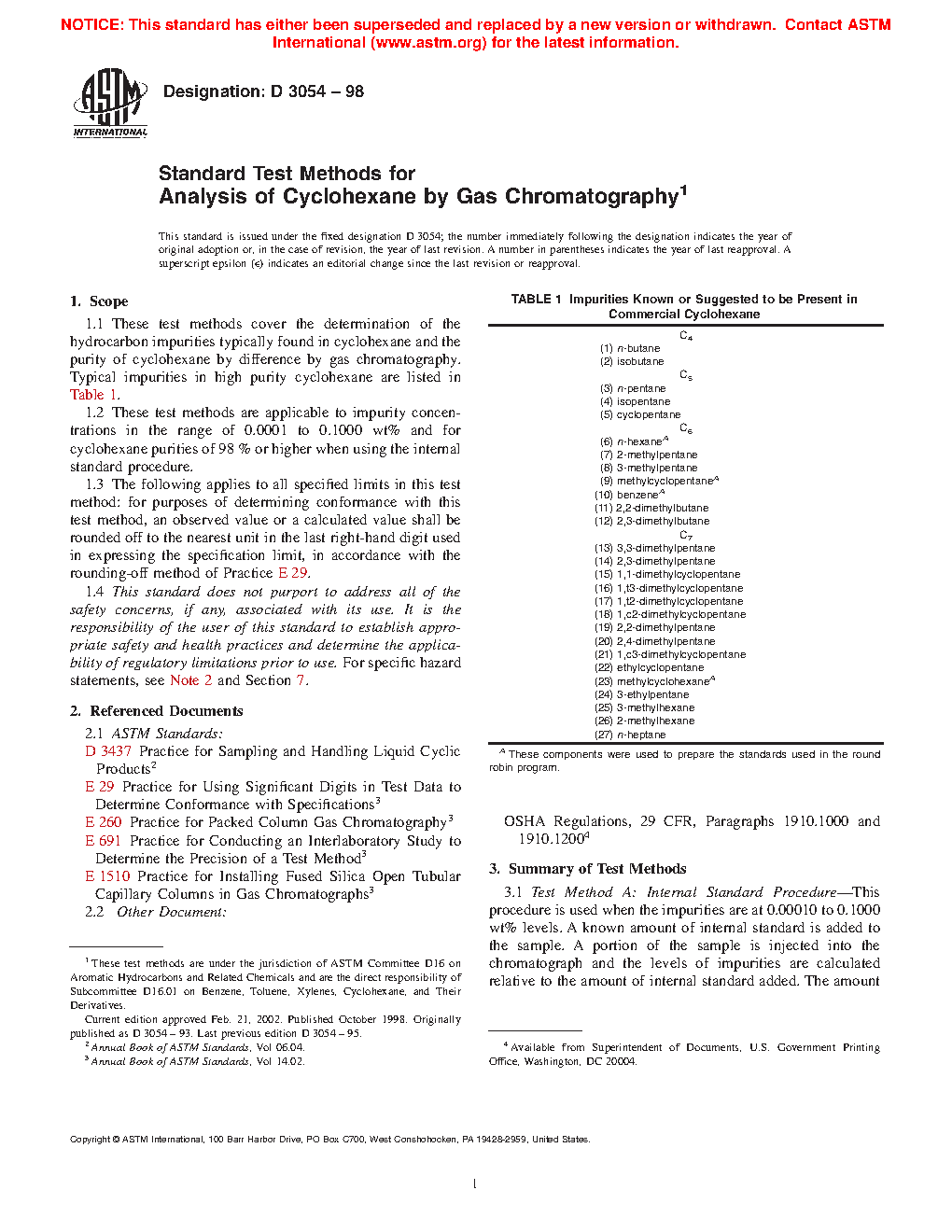 1.2 These test methods are applicable to impurity concentrations in the range of 0.0001 to 0.1000 wt% and for cyclohexane purities of 98% or higher when using the internal standard procedure.