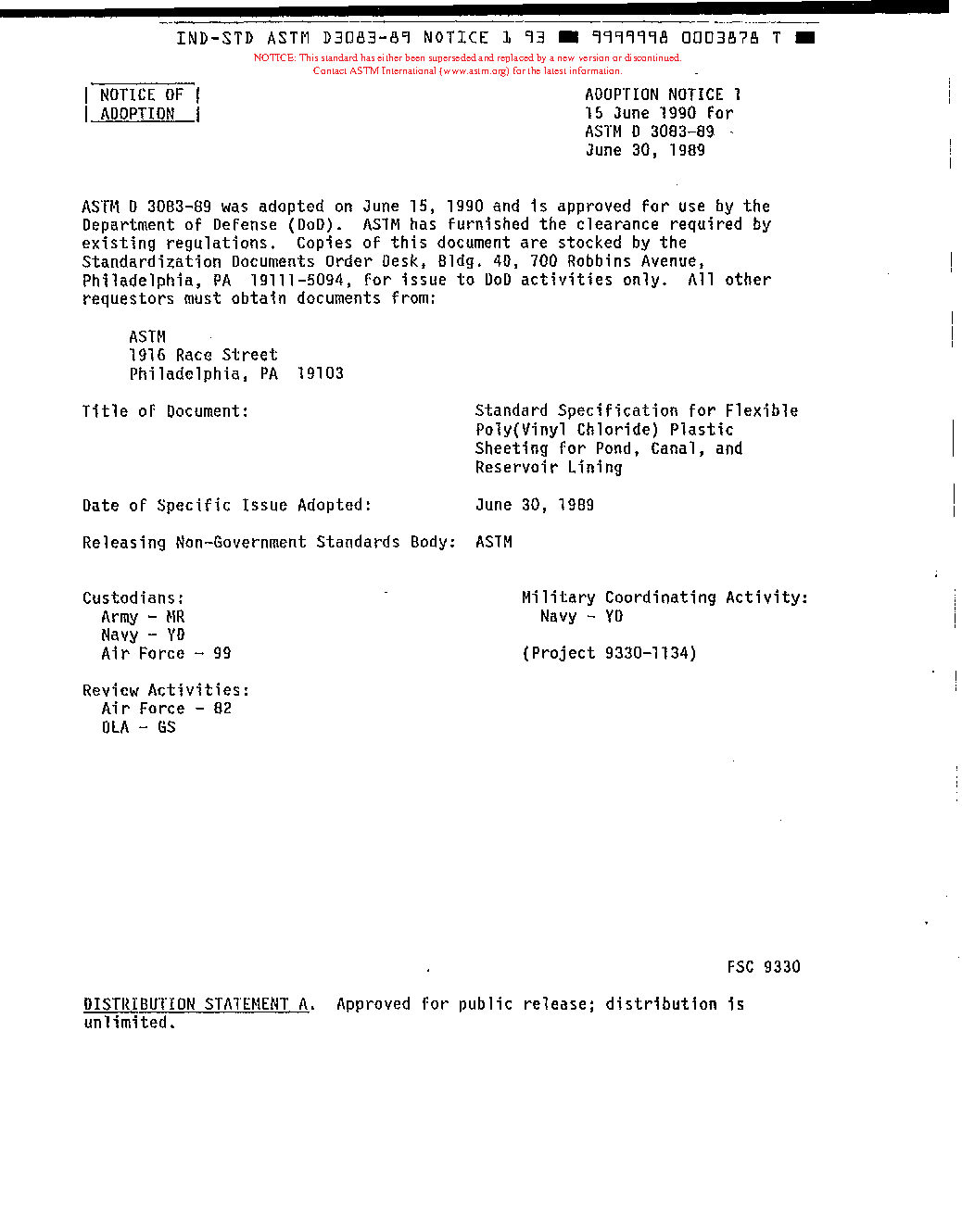 Specification for Flexible Poly (Vinyl Chloride) Plastic Sheeting for Pond, Canal, and Reservoir Lining (Withdrawn 1998)