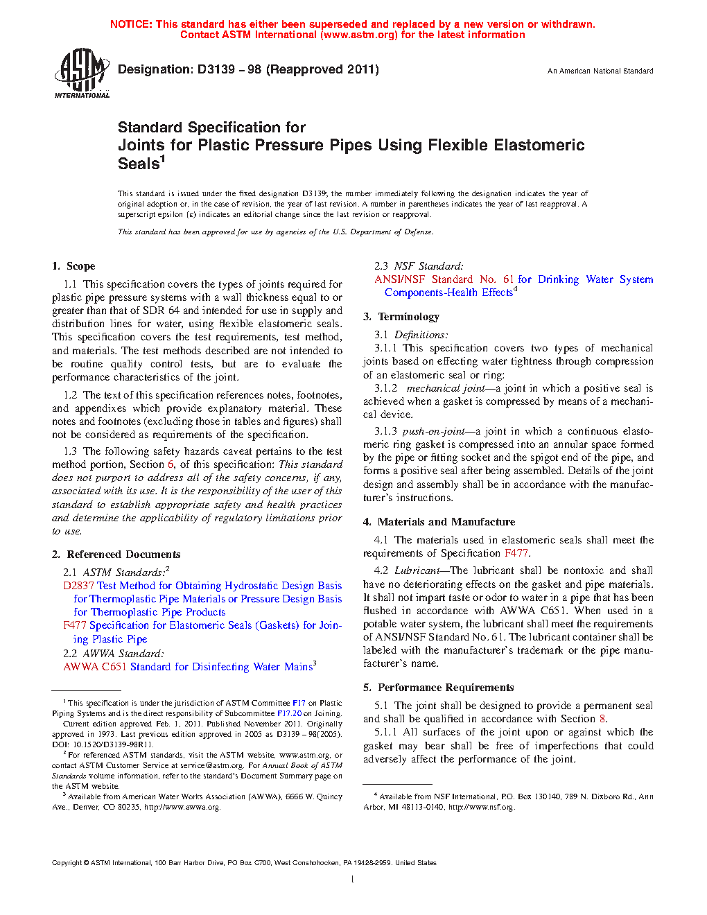 This specification covers the two types of joints, mechanical joint and push-on-joint, required for plastic pipe pressure systems with a wall thickness equal to or greater than that of SDR 64 intended for use in supply and distribution lines for water using flexible elastomeric seals. The joint shall be designed to provide a permanent seal, with surfaces free of imperfections that could adversely affect its performance. Internal hydrostatic pressure and vacuum tests shall be conducted on the assembled joints under standard laboratory temperature and relative humidity conditions. The joint assemblies shall conform to the pressure rating, stiffness, and deflection requirements.
