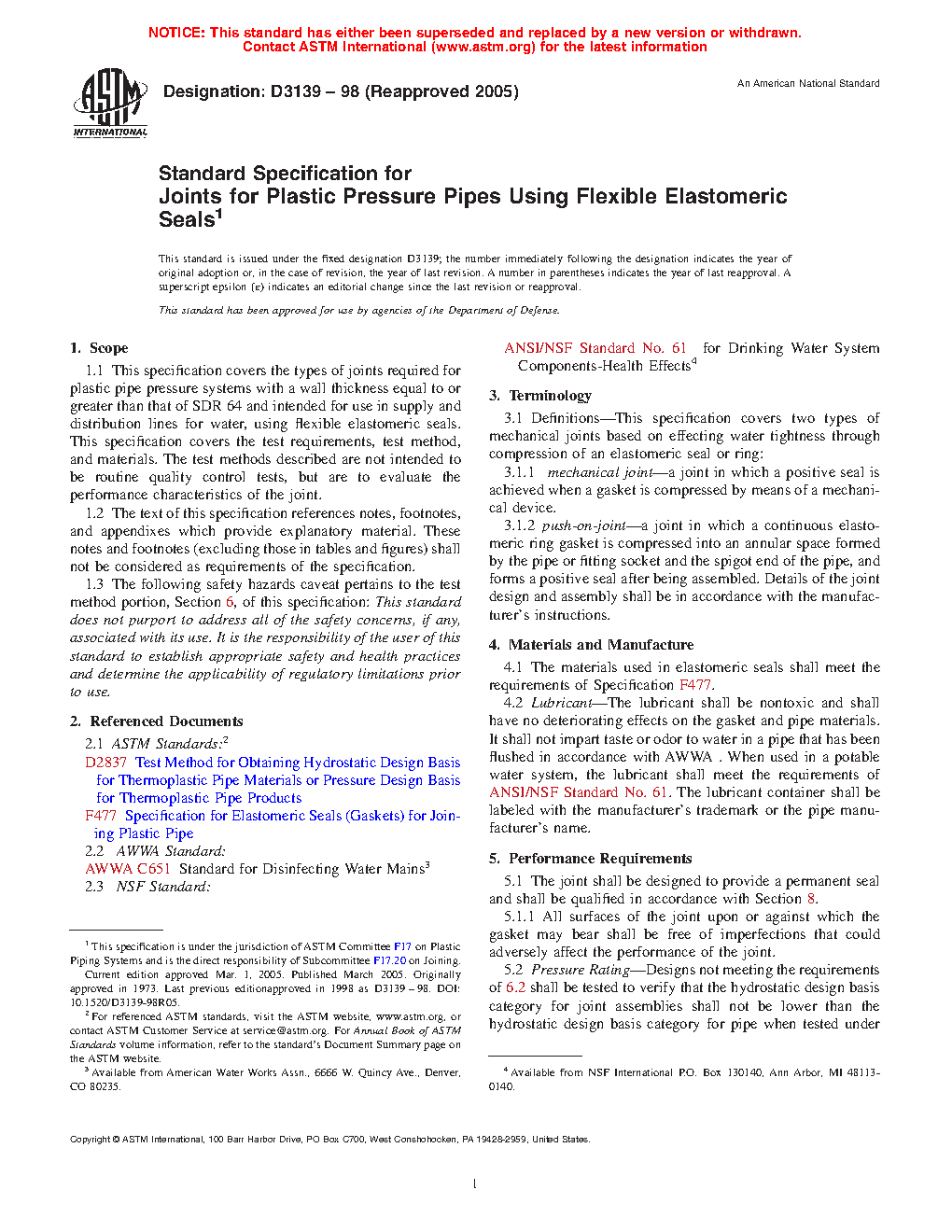 1.3 The following safety hazards caveat pertains to the test method portion, Section 6, of this specification: This standard does not purport to address all of the safety concerns, if any, associated with its use. It is the responsibility of the user of this standard to establish appropriate safety and health practices and determine the applicability of regulatory limitations prior to use. This specification covers the two types of joints, mechanical joint and push-on-joint, required for plastic pipe pressure systems with a wall thickness equal to or greater than that of SDR 64 intended for use in supply and distribution lines for water using flexible elastomeric seals. The joint shall be designed to provide a permanent seal, with surfaces free of imperfections that could adversely affect its performance. Internal hydrostatic pressure and vacuum tests shall be conducted on the assembled joints under standard laboratory temperature and relative humidity conditions. The joint assemblies shall conform to the pressure rating, stiffness, and deflection requirements.