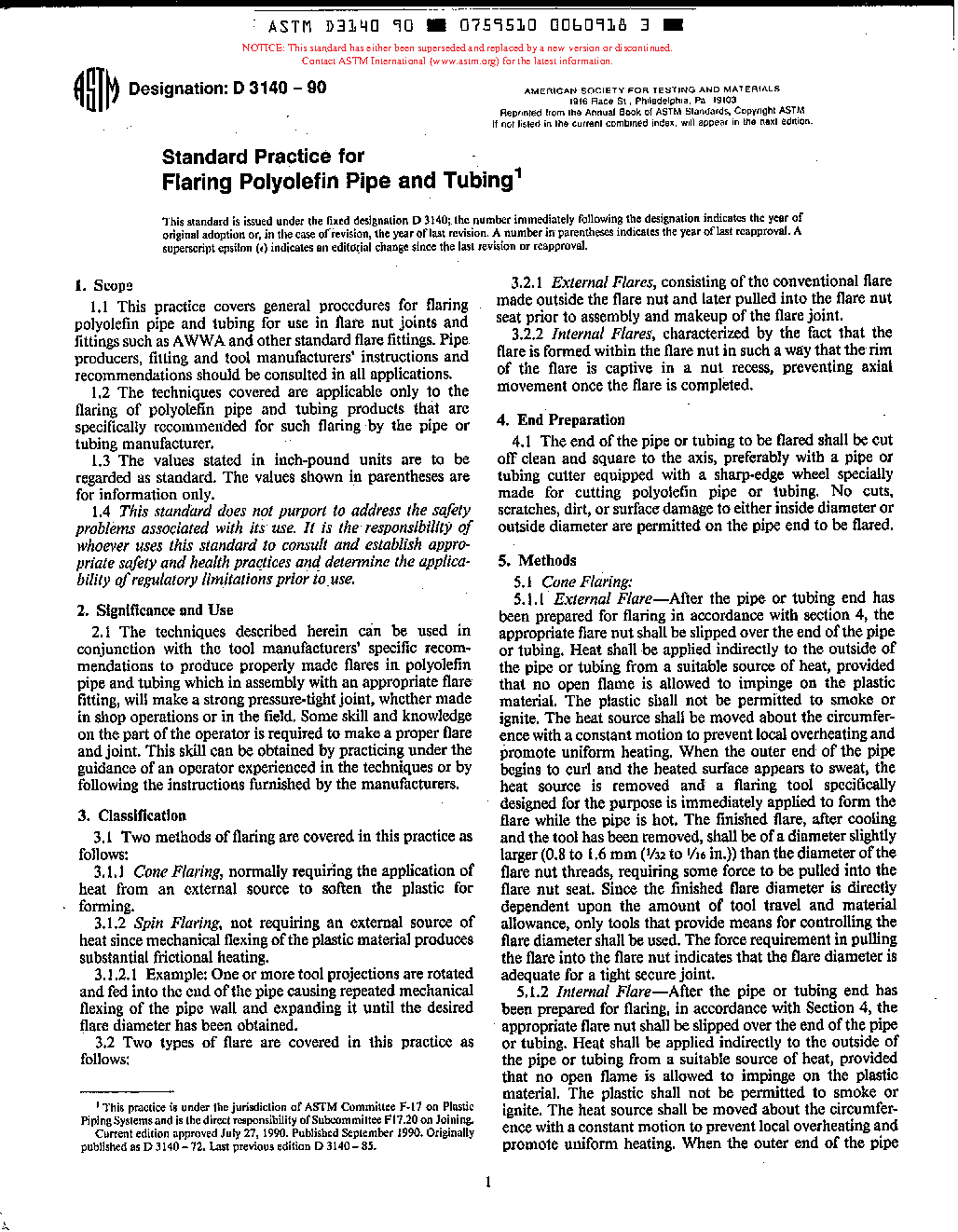 Standard Practice for Flaring Polyolefin Pipe and Tubing (Withdrawn 1999)