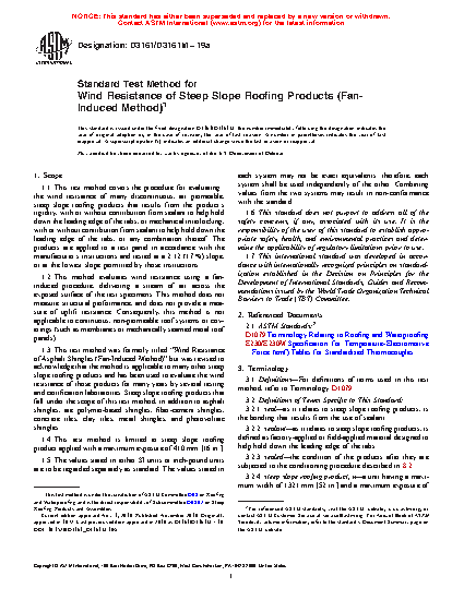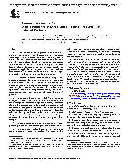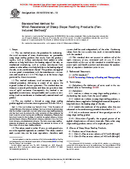 1.3 This test method was formerly titled “Wind Resistance of Asphalt Shingles (Fan-Induced Method)” but was revised to acknowledge that the method is applicable to many other steep slope roofing products and has been used to evaluate the wind resistance of those products for many years by several testing and certification laboratories. Steep slope roofing products that fall under the scope of this test method, in addition to asphalt shingles, are polymer-based shingles, fiber-cement shingles, concrete tiles, clay tiles, metal shingles, and photovoltaic shingles.