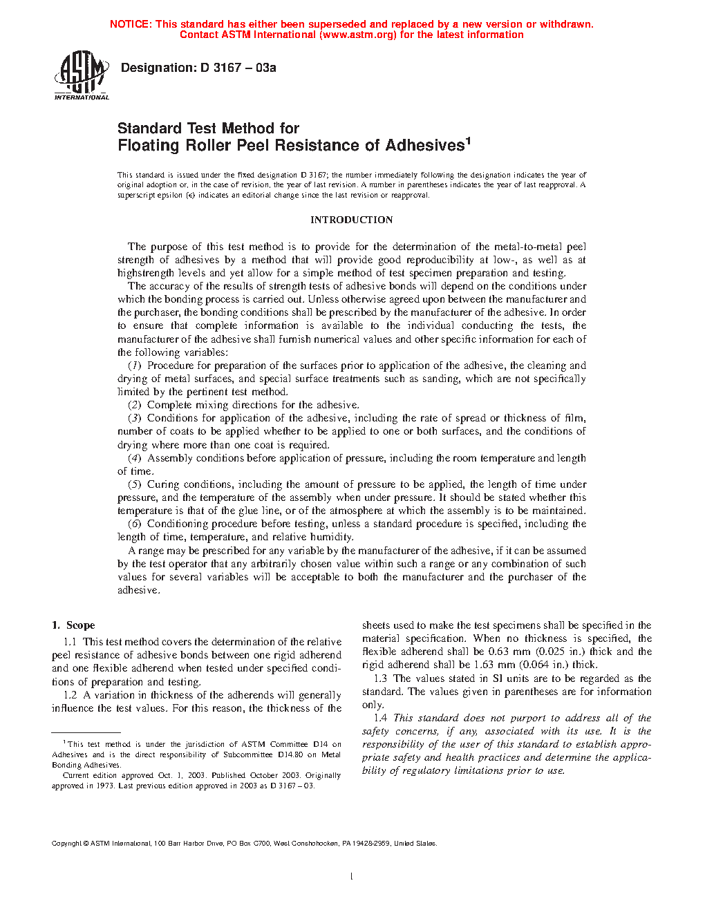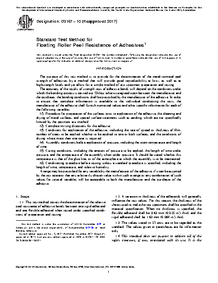 1.1 This test method covers the determination of the relative peel resistance of adhesive bonds between one rigid adherend and one flexible adherend when tested under specified conditions of preparation and testing.