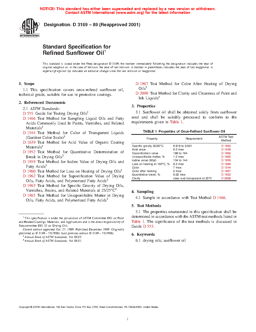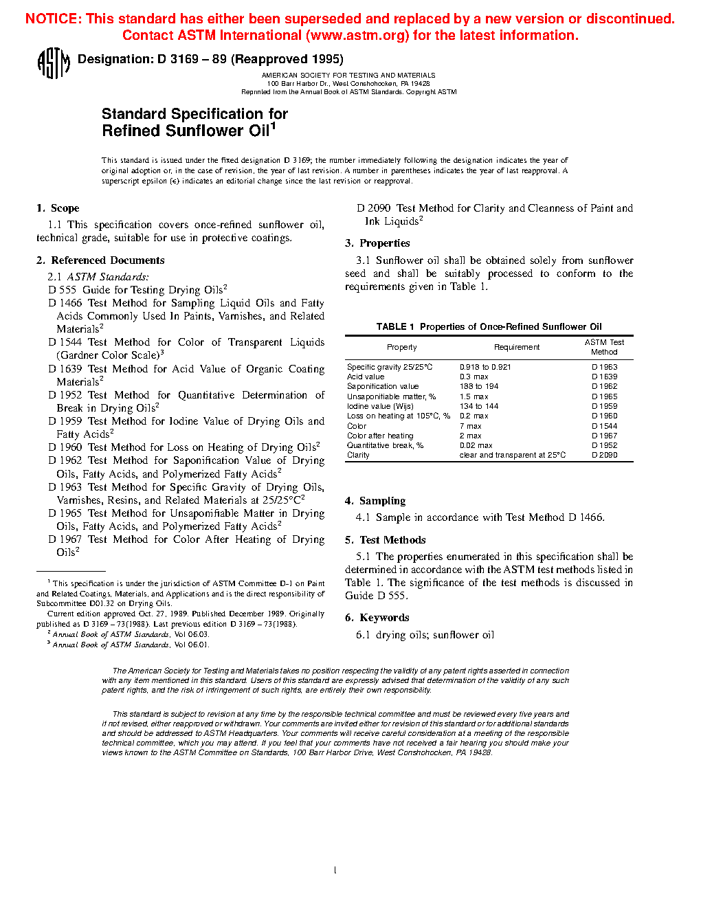 1.1 This specification covers once-refined sunflower oil, technical grade, suitable for use in protective coatings.