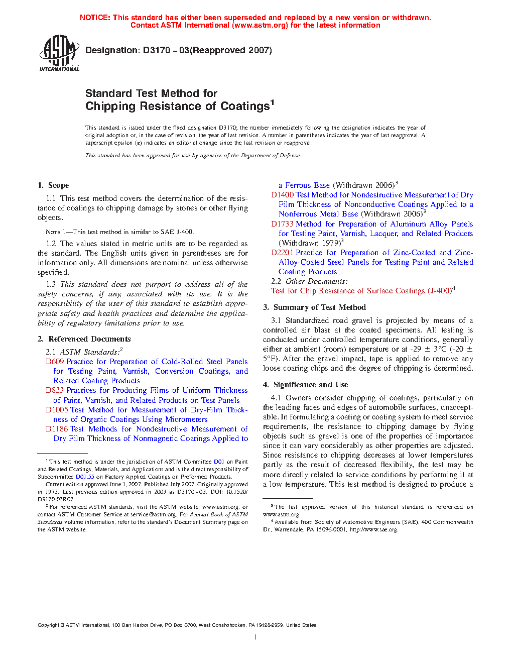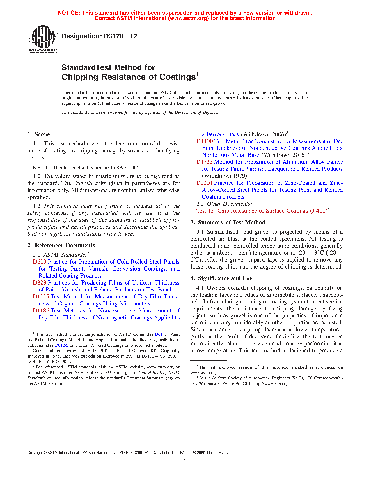 1.1 This test method covers the determination of the resistance of coatings to chipping damage by stones or other flying objects.