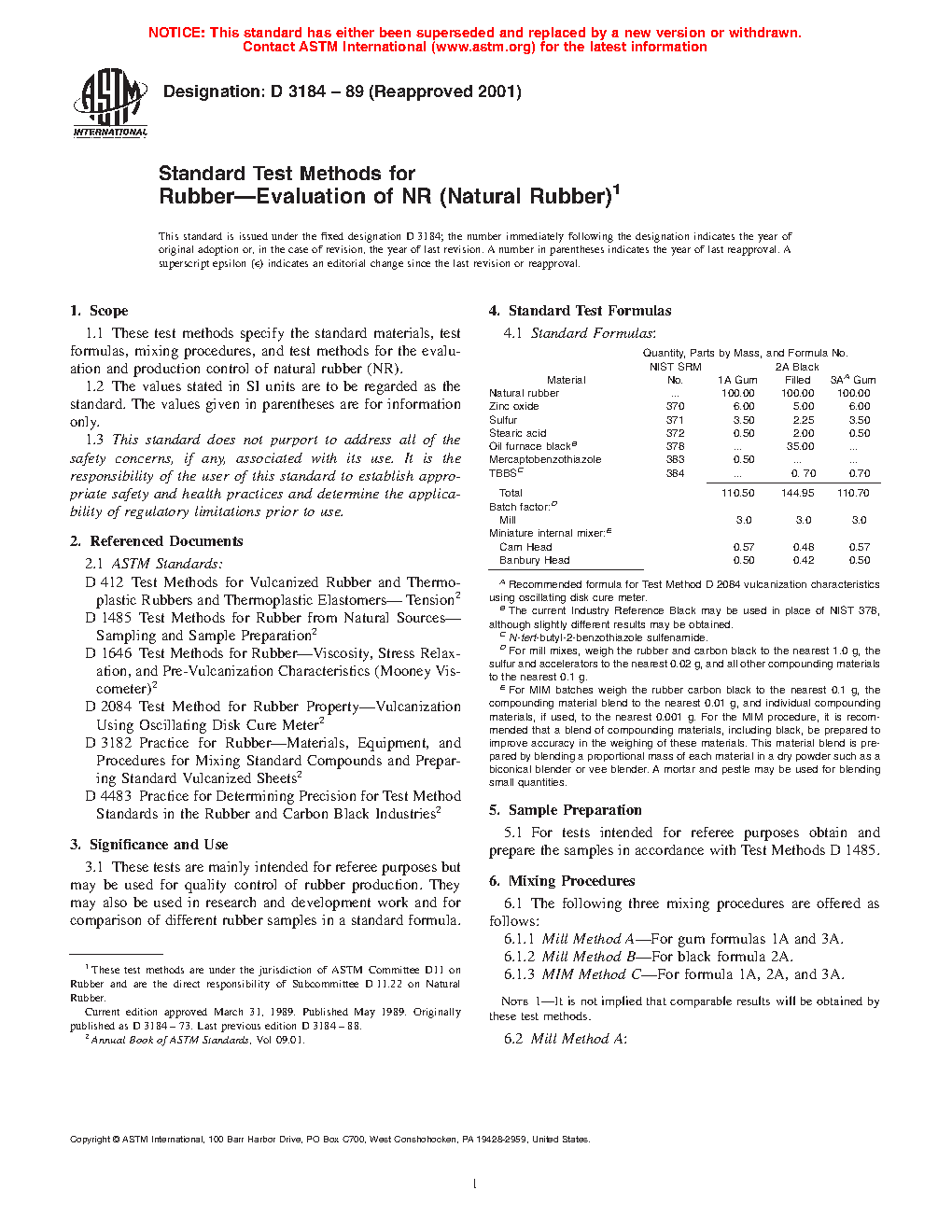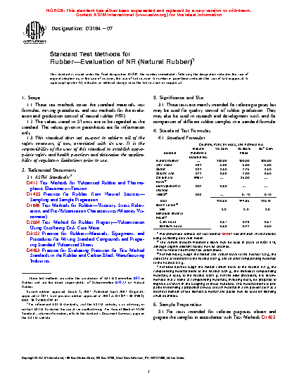 1.1 These test methods specify the standard materials, test formulas, mixing procedures, and test methods for the evaluation and production control of natural rubber (NR).