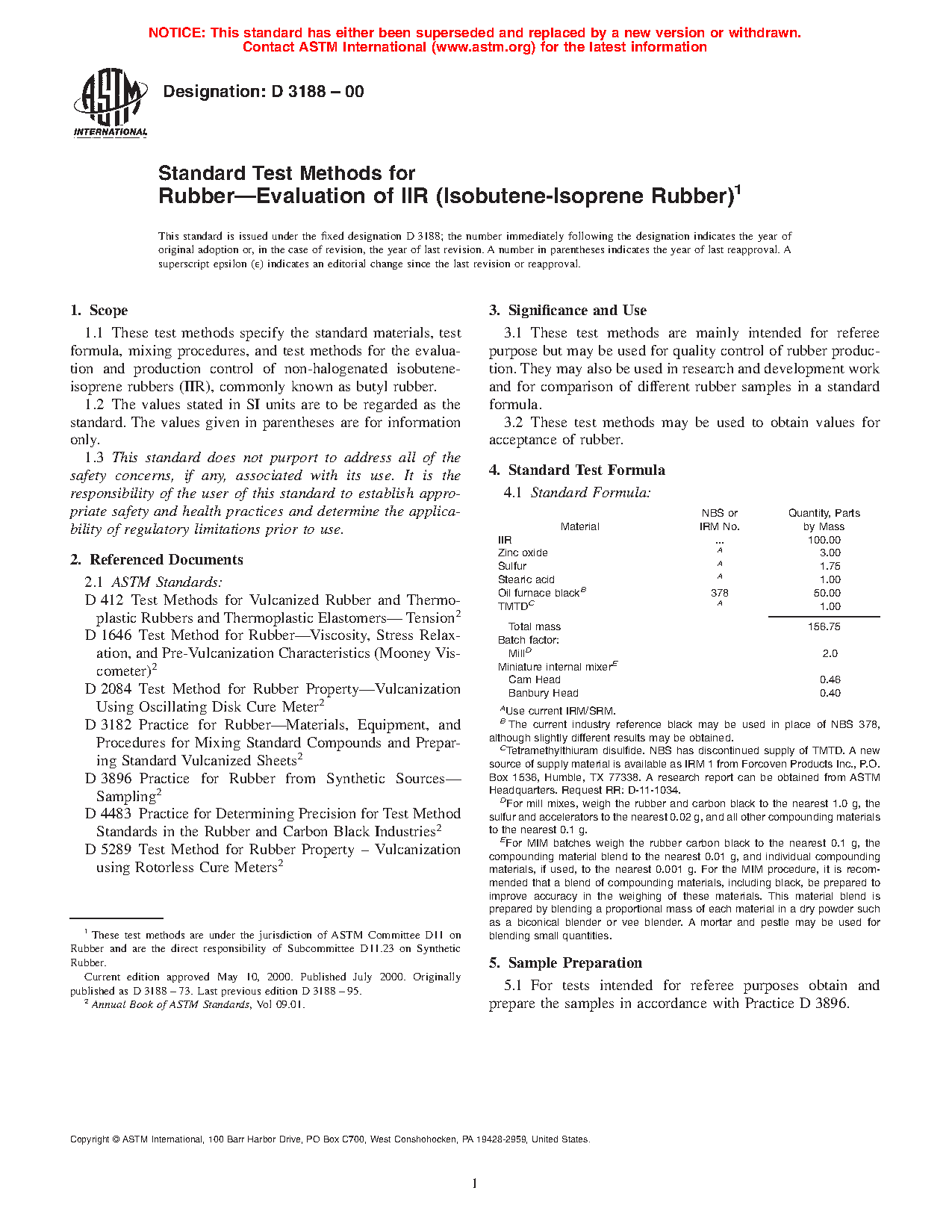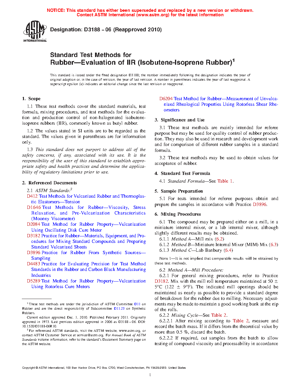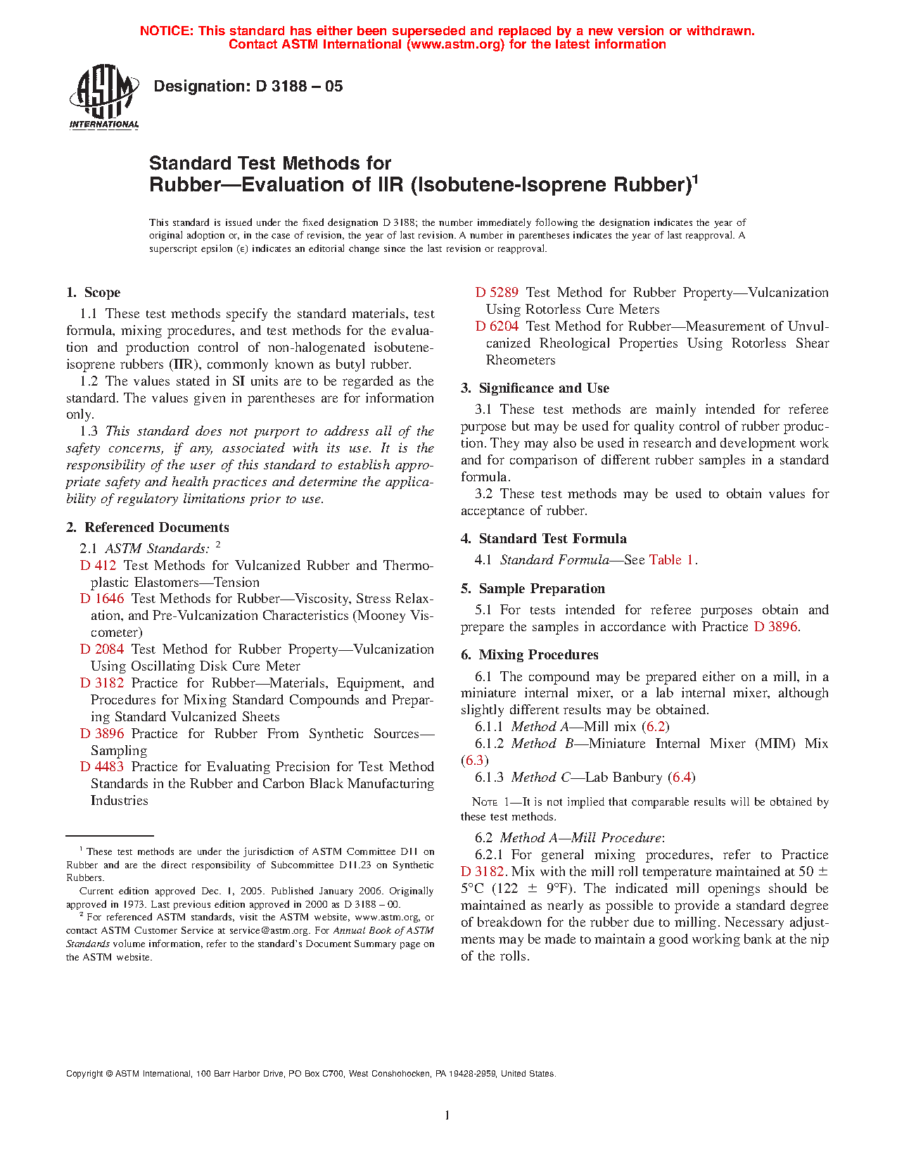 1.1 These test methods cover the standard materials, test formula, mixing procedures, and test methods for the evaluation and production control of non-halogenated isobutene-isoprene rubbers (IIR), commonly known as butyl rubber.