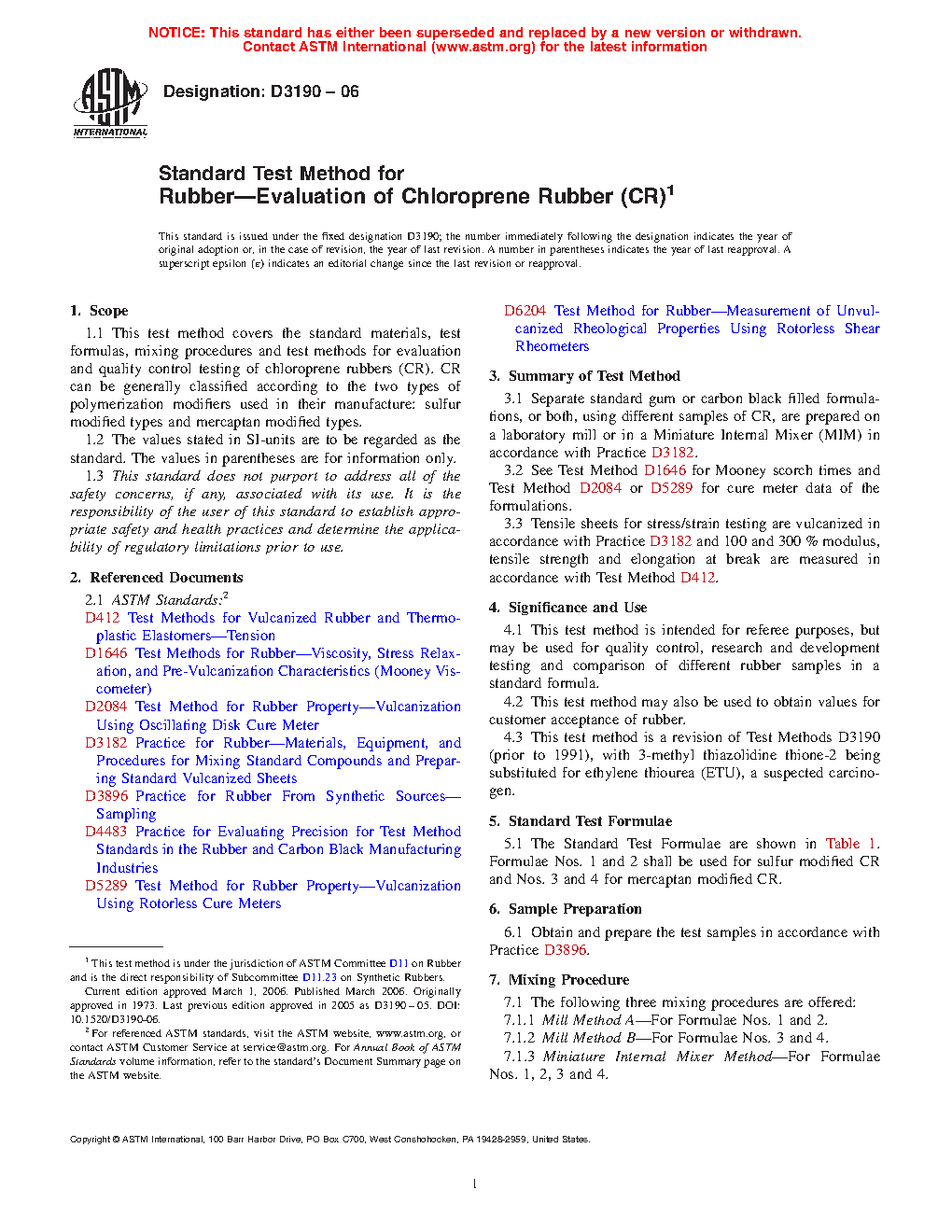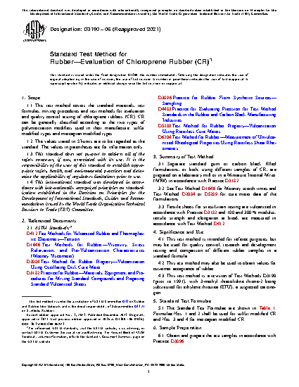 1.1 This test method covers the standard materials, test formulas, mixing procedures and test methods for evaluation and quality control testing of chloroprene rubbers (CR). CR can be generally classified according to the two types of polymerization modifiers used in their manufacture: sulfur modified types and mercaptan modified types.