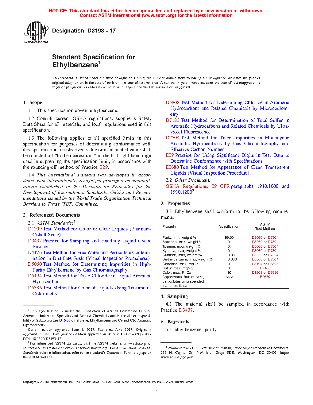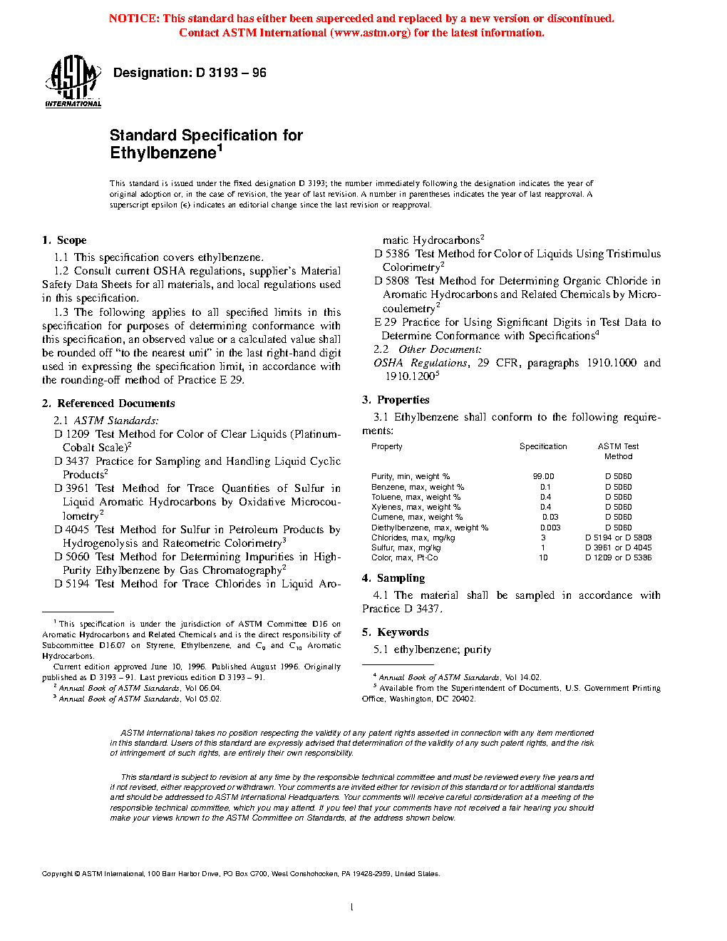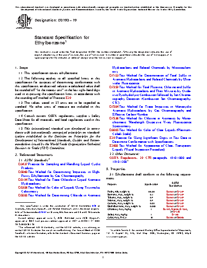 This specification covers ethylbenzene. Different tests shall be conducted in order to determine the following properties of ethylbenzene: purity, benzene content, toluene content, xylene content, cumene content, diethylbenzene content, chloride content, sulfur content, and color.