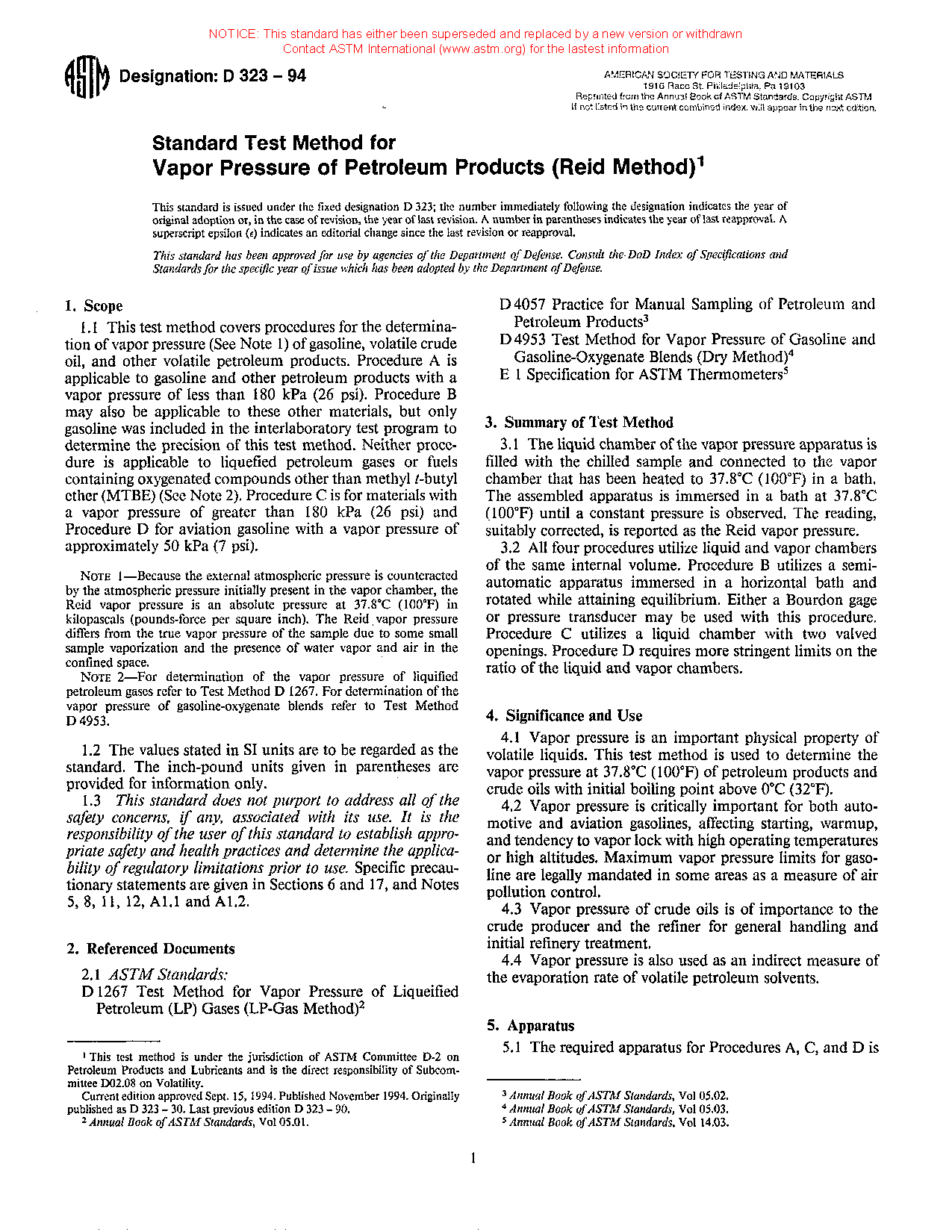 1.1 This test method covers procedures for the determination of vapor pressure (see Note 1) of gasoline, volatile crude oil, and other volatile petroleum products.