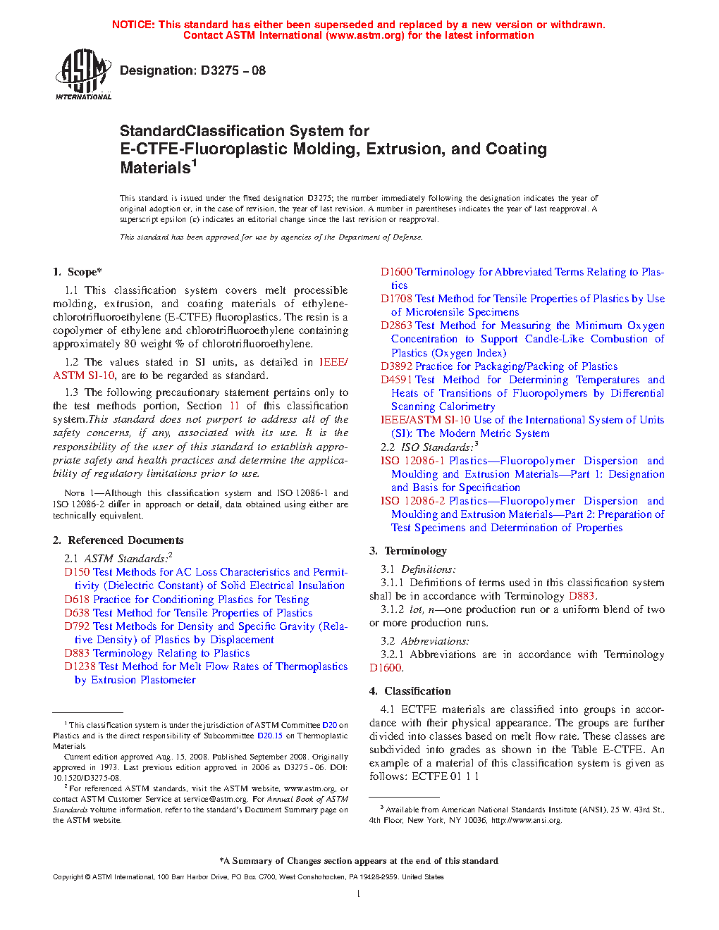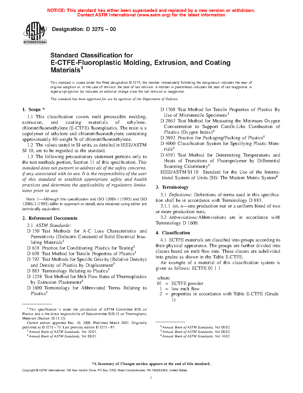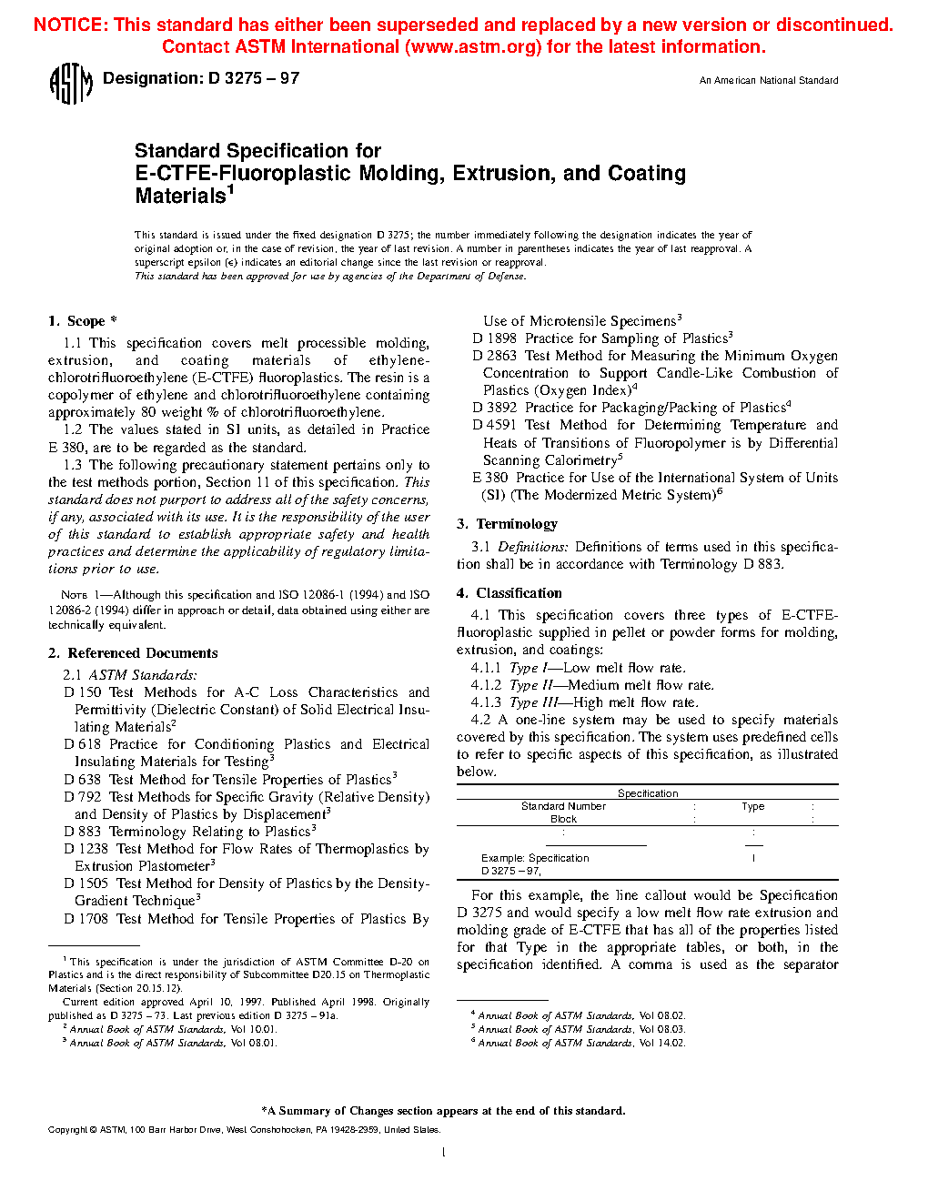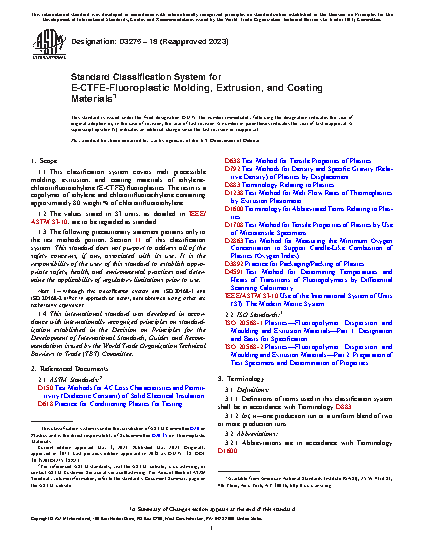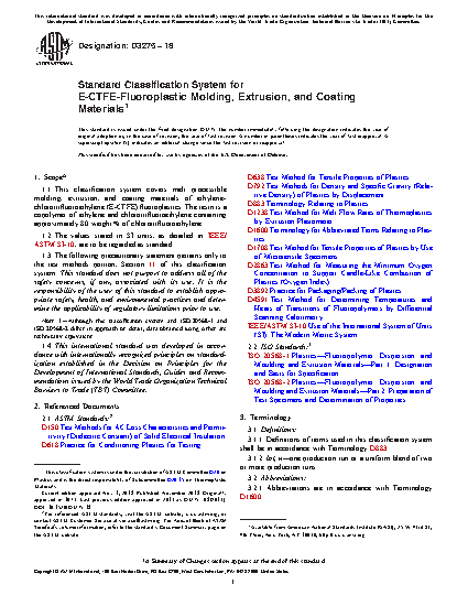 1.1 This classification covers melt processible molding, extrusion, and coating materials of ethylene-chlorotrifluoroethylene (E-CTFE) fluoroplastics. The resin is a copolymer of ethylene and chlorotrifluoroethylene containing approximately 80 weight % of chlorotrifluoroethylene.