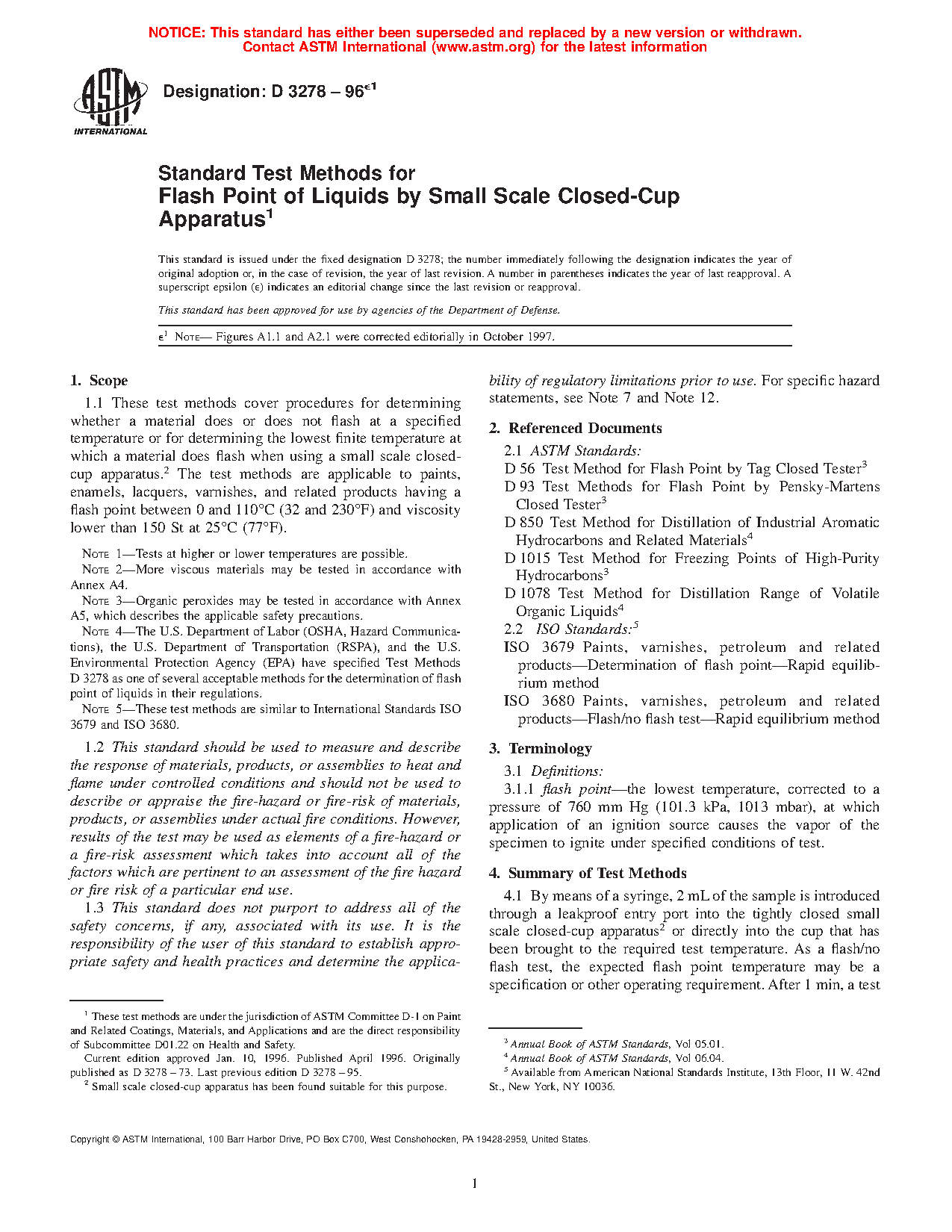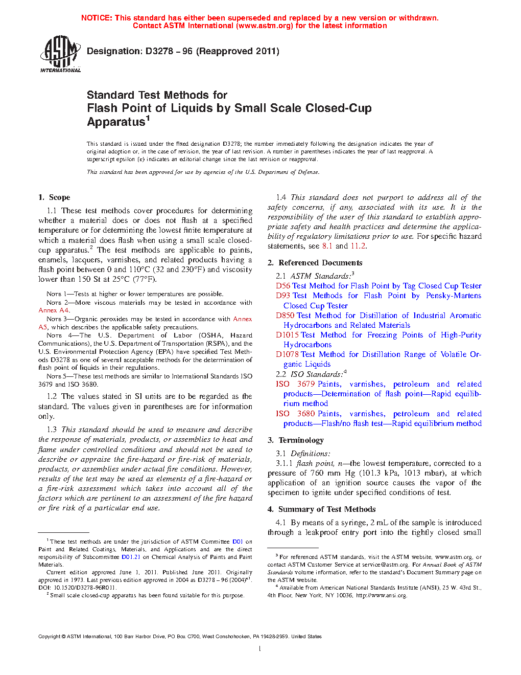 Note 4: The U.S. Department of Labor (OSHA, Hazard Communications), the U.S. Department of Transportation (RSPA), and the U.S. Environmental Protection Agency (EPA) have specified Test Methods D3278 as one of several acceptable methods for the determination of flash point of liquids in their regulations.