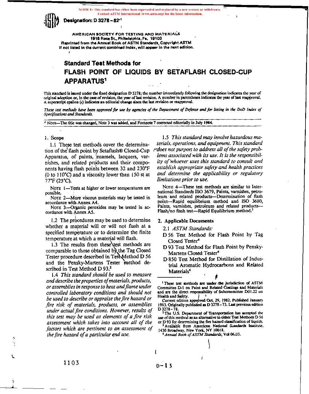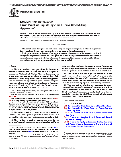 1.1 These test methods cover procedures for determining whether a material does or does not flash at a specified temperature (flash/no flash Method A) or for determining the lowest finite temperature at which a material does flash (Method B), when using a small scale closed-cup apparatus. The test methods are applicable to paints, enamels, lacquers, varnishes, solvents, and related products having a flash point between 0 °C and 110 °C (32 °F and 230 °F) and viscosity lower than 15 000 mm2/s (cSt) at 25 °C (77 °F).