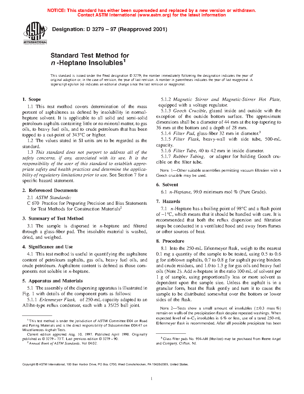 1.1 This test method covers determination of the mass percent of asphaltenes as defined by insolubility in normal-heptane solvent. It is applicable to all solid and semi-solid petroleum asphalts containing little or no mineral matter, to gas oils, to heavy fuel oils, and to crude petroleum that has been topped to a cut-point of 343 °C or higher.