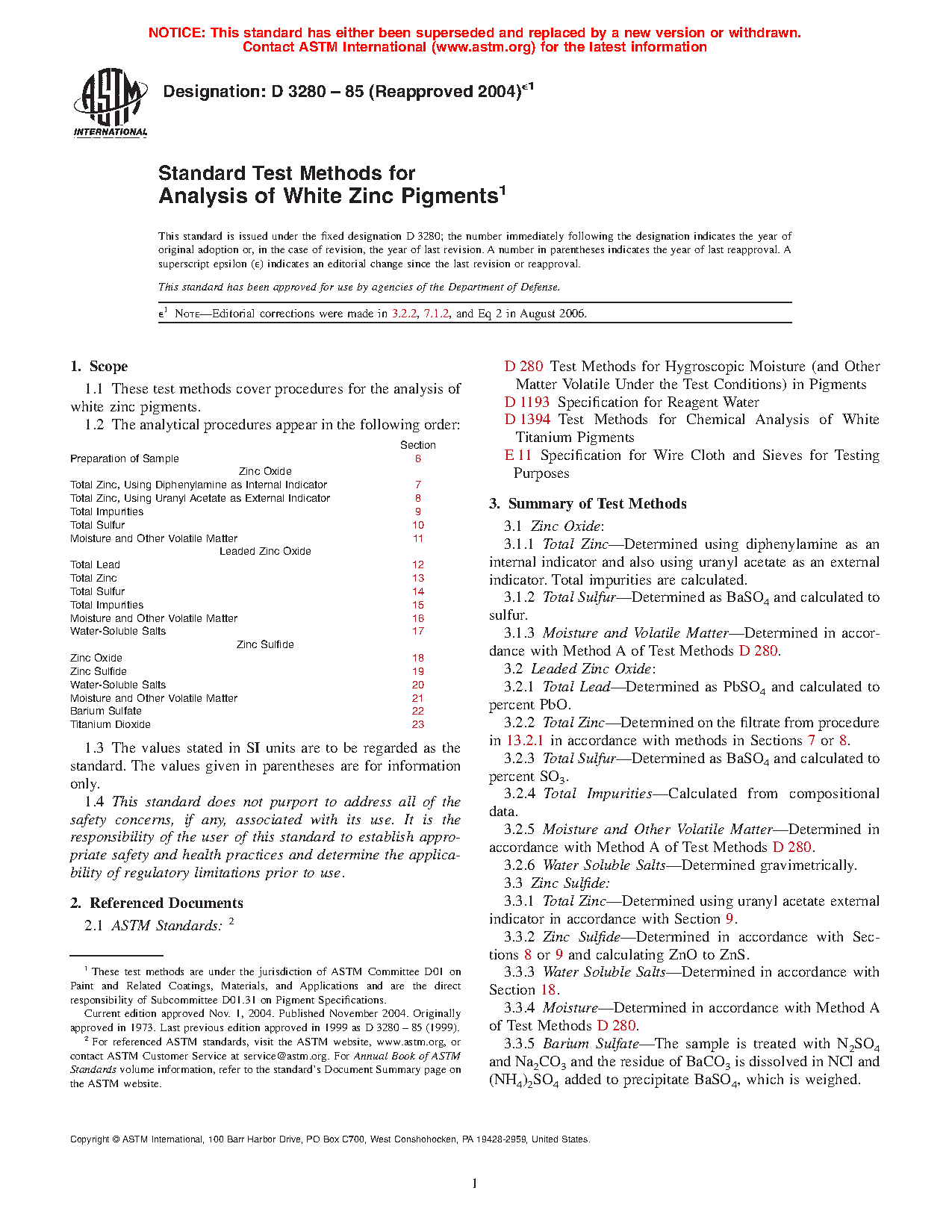 White zinc pigments find considerable use in white paints, and as such it is useful to formulators and users to be able to monitor the amounts of these pigments in whole paints. It is also of interest to raw material suppliers and paint producers to check the specifications of each pigment.