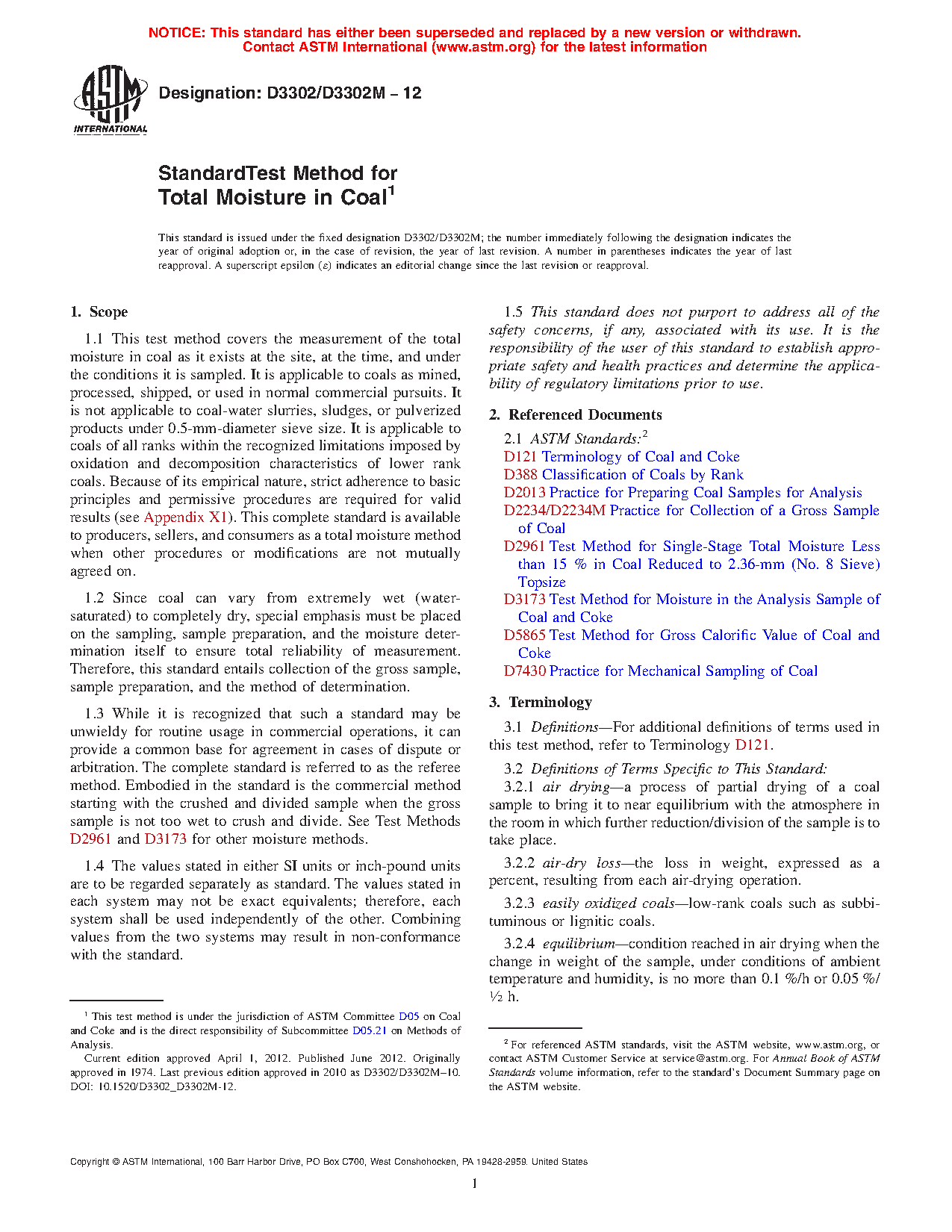 1.1 This test method covers the measurement of the total moisture in coal as it exists at the site, at the time, and under the conditions it is sampled. It is applicable to coals as mined, processed, shipped, or used in normal commercial pursuits. It is not applicable to coal-water slurries, sludges, or pulverized products under 0.5 mm-diameter sieve size. It is applicable to coals of all ranks within the recognized limitations imposed by oxidation and decomposition characteristics of lower rank coals. Because of its empirical nature, strict adherence to basic principles and permissive procedures are required for valid results (see Appendix X1). This complete standard is available to producers, sellers, and consumers as a total moisture method when other procedures or modifications are not mutually agreed on.