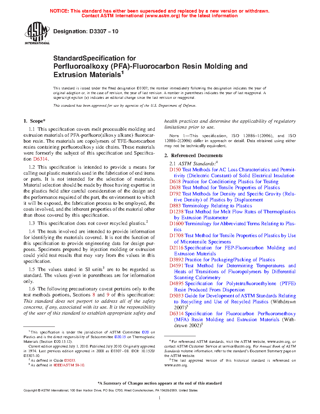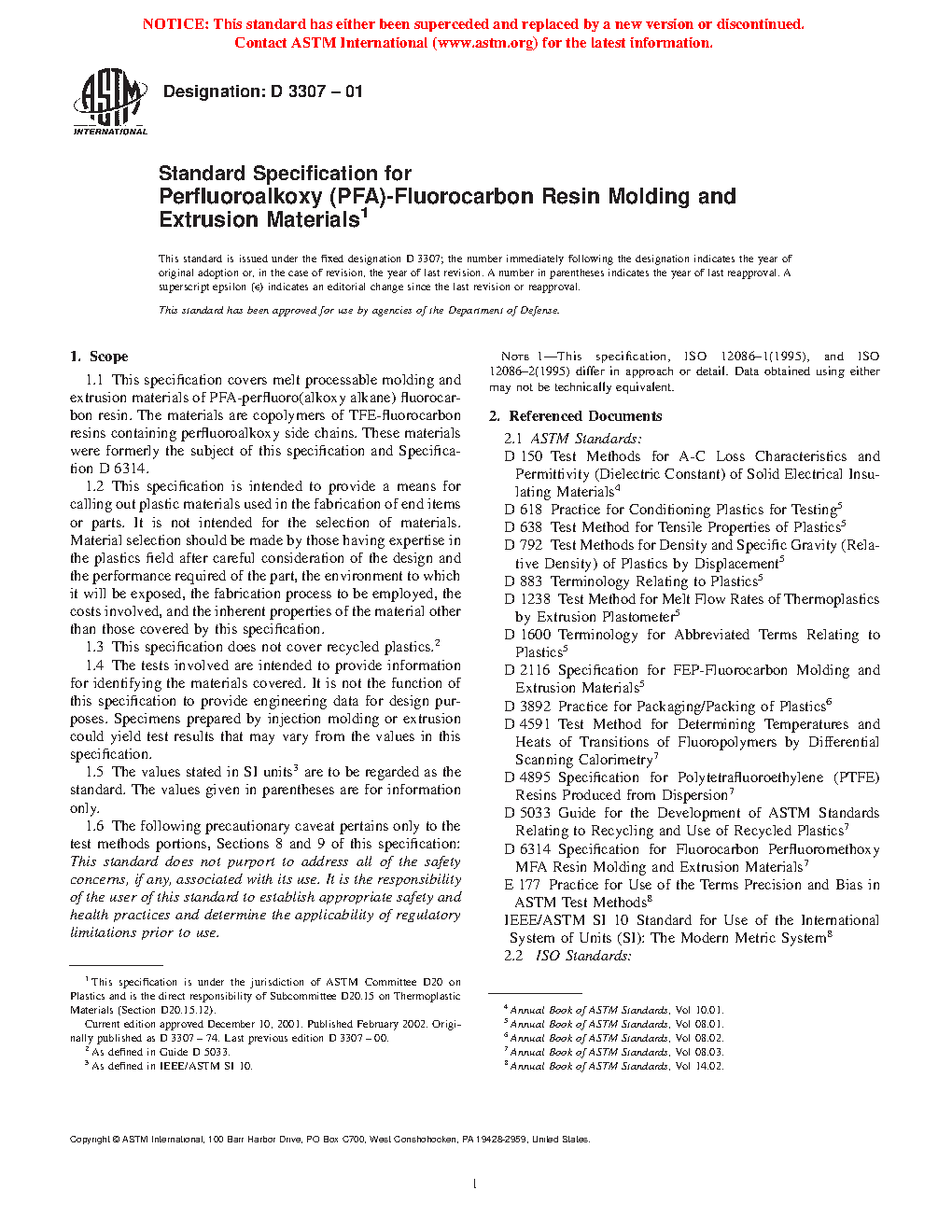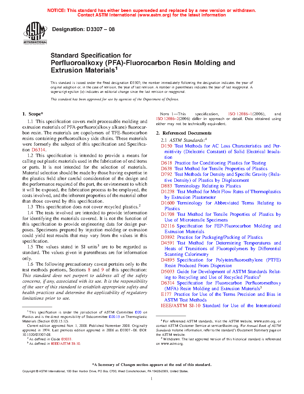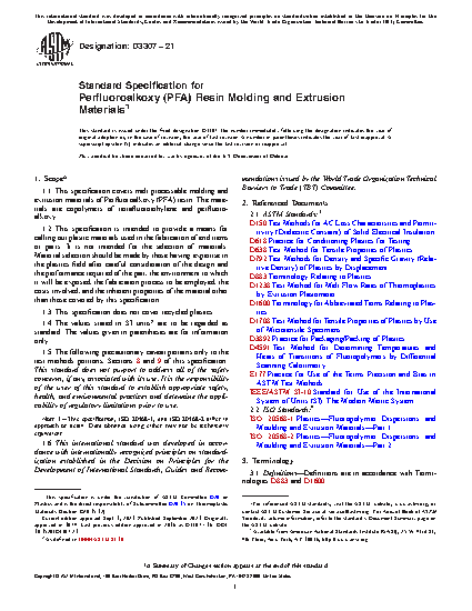 1.1 This specification covers melt processable molding and extrusion materials of PFA-perfluoro(alkoxy alkane) fluorocarbon resin. The materials are copolymers of TFE-fluorocarbon resins containing perfluoroalkoxy side chains. These materials were formerly the subject of this specification and Specification D 6314.