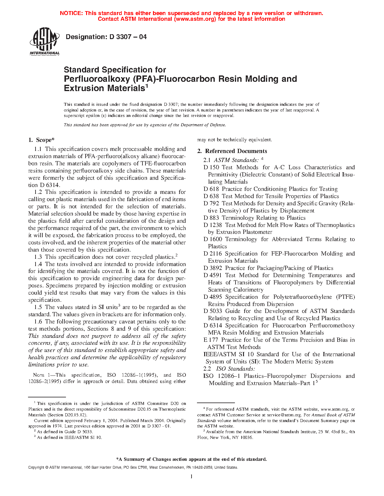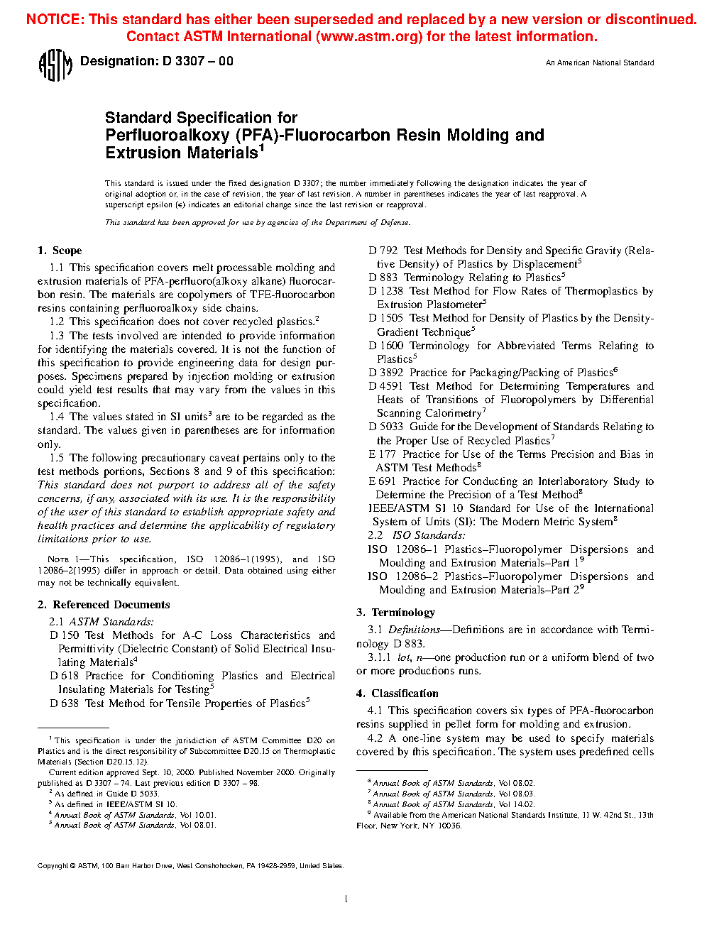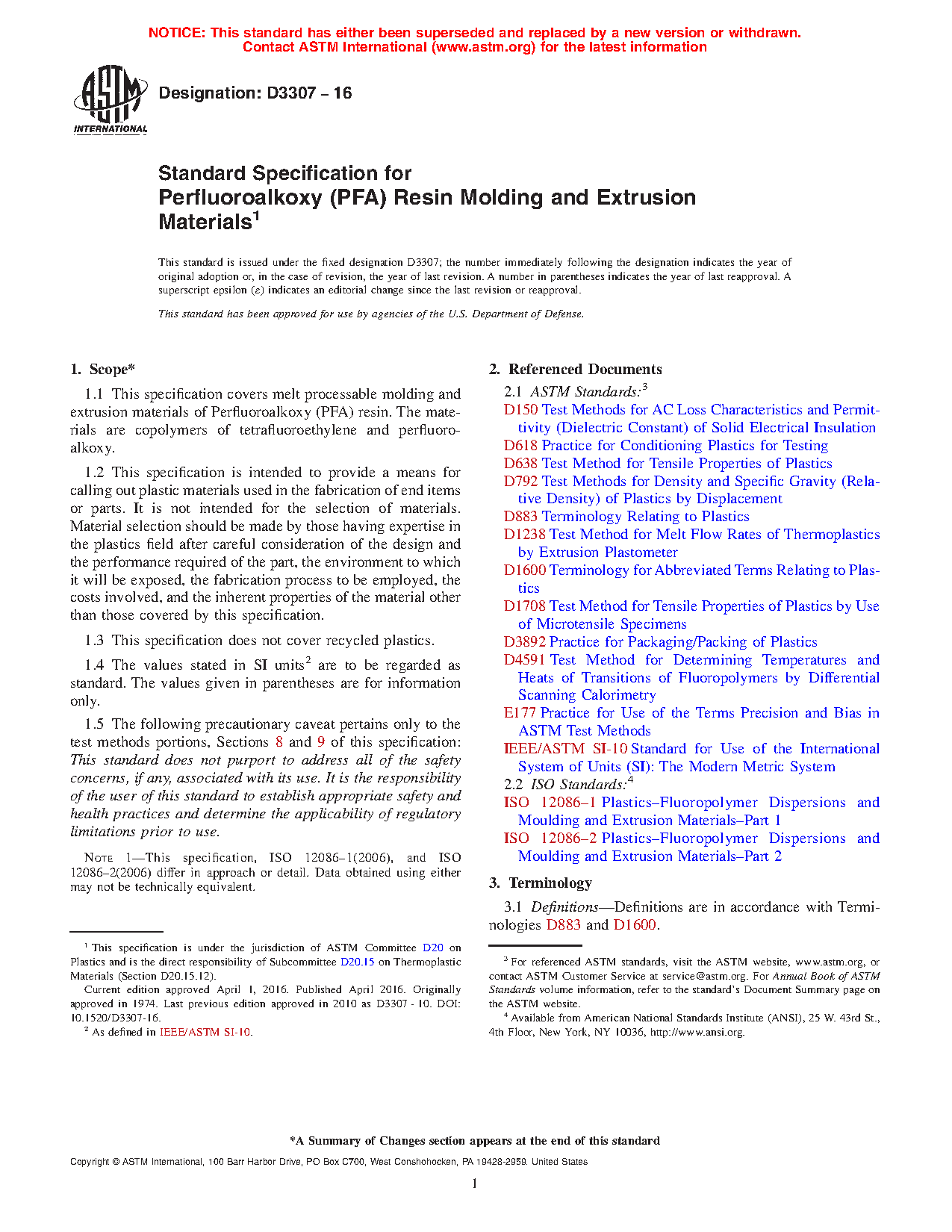 1.1 This specification covers melt processable molding and extrusion materials of PFA-perfluoro(alkoxy alkane) fluorocarbon resin. The materials are copolymers of TFE-fluorocarbon resins containing perfluoroalkoxy side chains. These materials were formerly the subject of this specification and Specification D 6314.