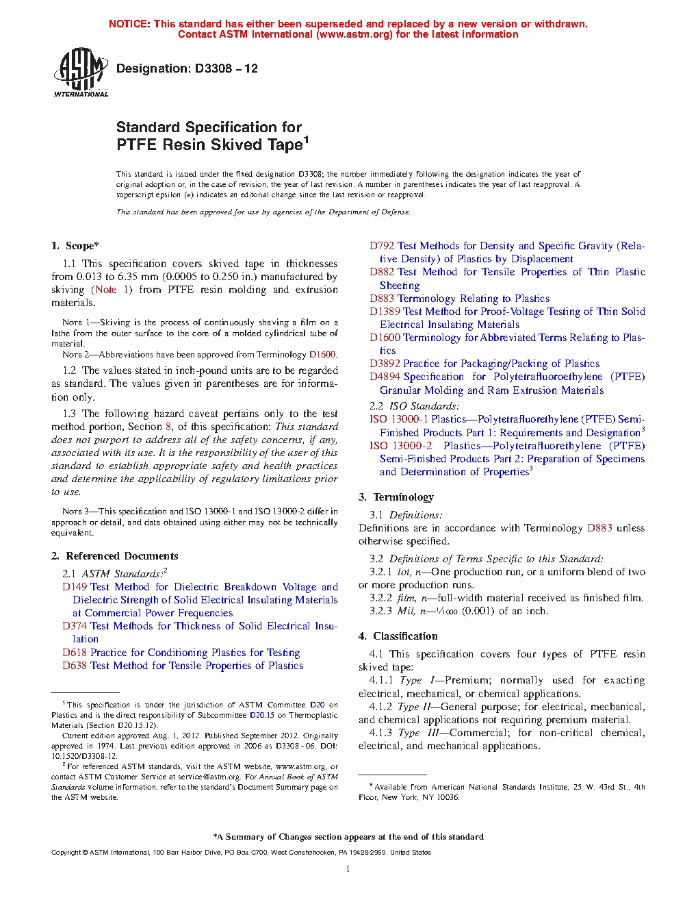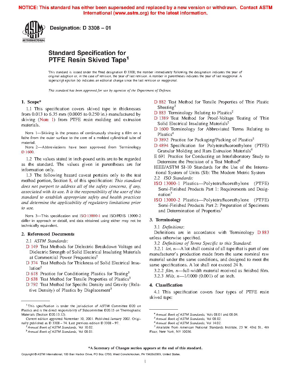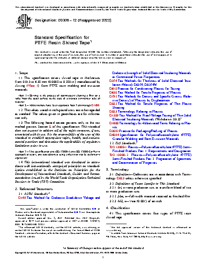 1.1 This specification covers skived tape in thicknesses from 0.013 to 6.35 mm (0.0005 to 0.250 in.) manufactured by skiving (Note 1) from PTFE resin molding and extrusion materials.