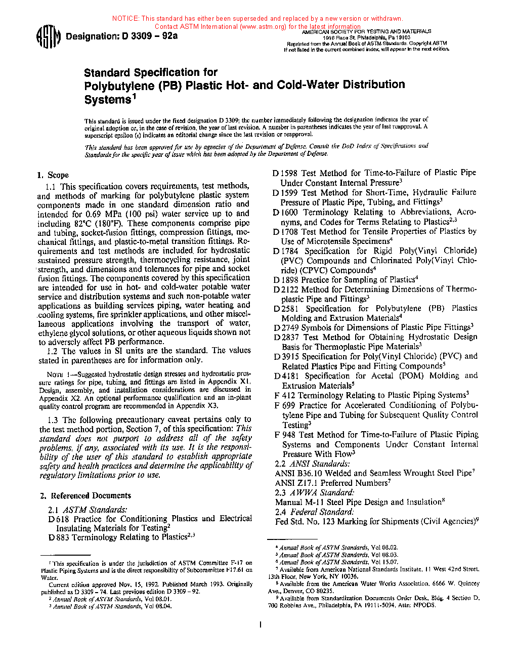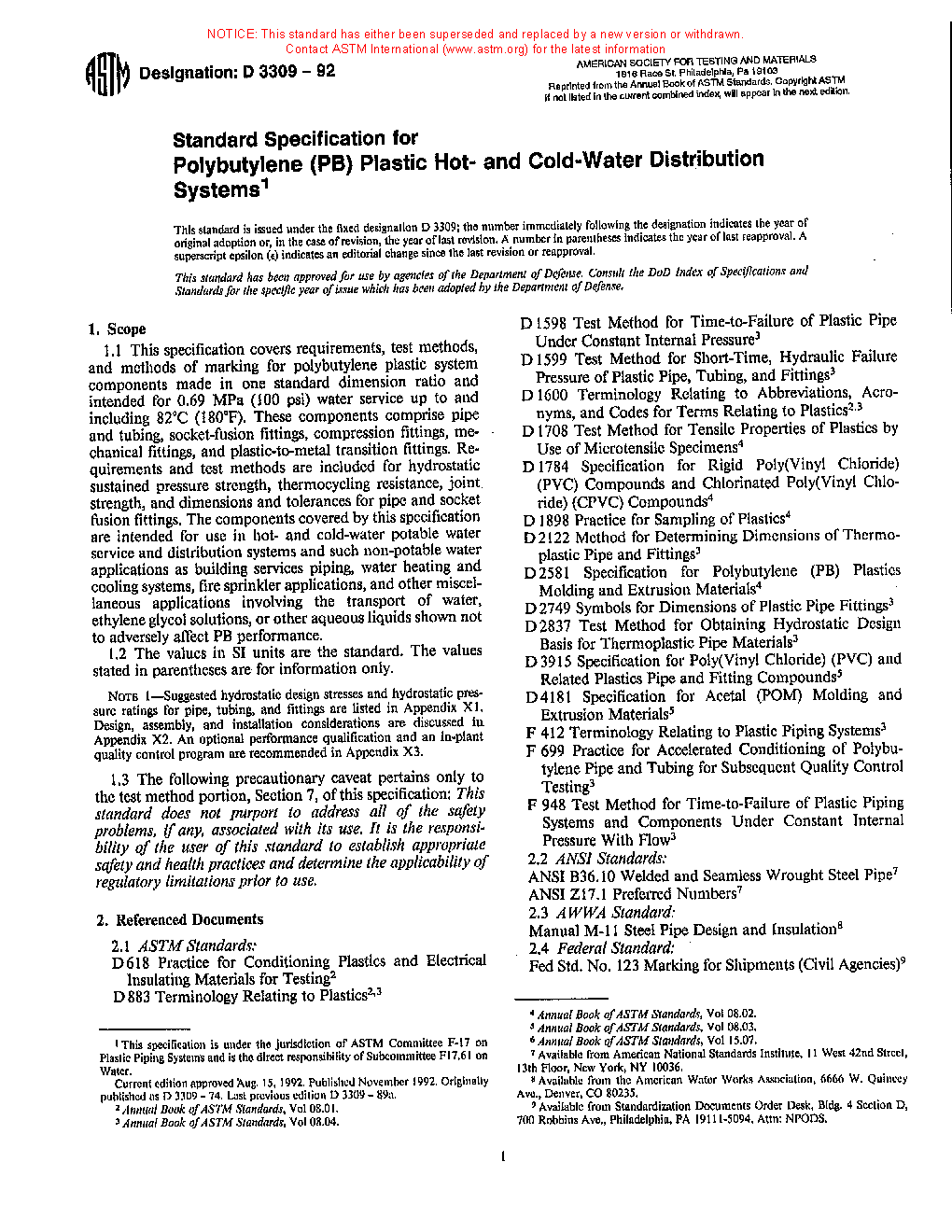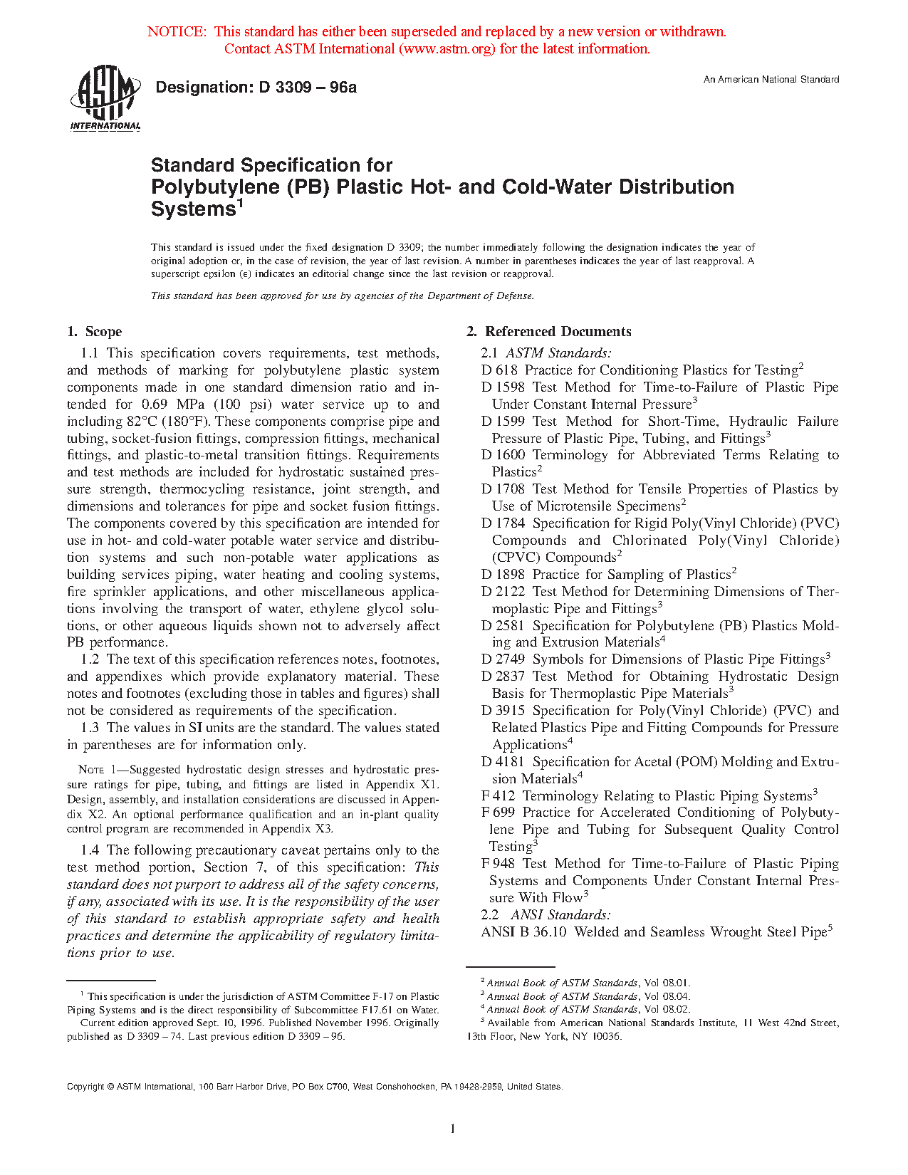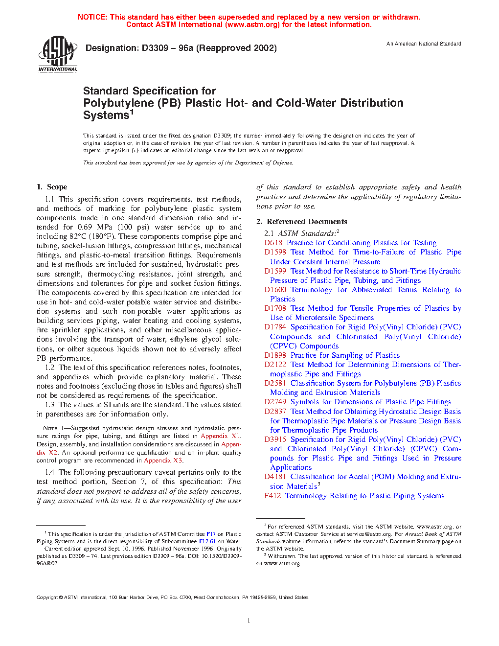 Standard Specification for Polybutylene (PB) Plastic Hot-and Cold-Water Distribution Systems