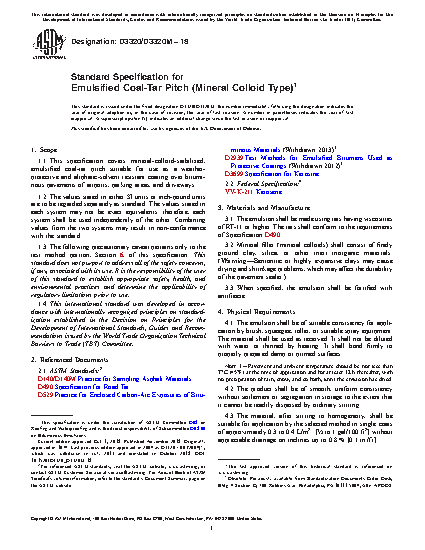 This specification describes the test methods for and physical requirements of mineral-colloid-stabilized, emulsified coal-tar pitch suitable for use as a weather-protective and aliphatic-solvent resistant coating over bituminous pavements of airports, parking areas, and driveways. The emulsion shall be made using tars having viscosities of RT-11 or higher, and the mineral filler (mineral colloids) shall consist of finely ground clay, silica, or other inert inorganic materials. And when specified, the emulsion shall be fortified with antifreeze. The properties for which coal-tar pitches shall be appropriately tested on and accordingly adhere to are: wet film continuity; freezing resistance; density; volatile matter content; residue by evaporation; volatilization resistance and residue weight loss; solubility of residue in CS2; ash content of residue; flammability; drying time and firm set; heat resistance; resistance to kerosene and water; and impact resistance before and after accelerated weathering.