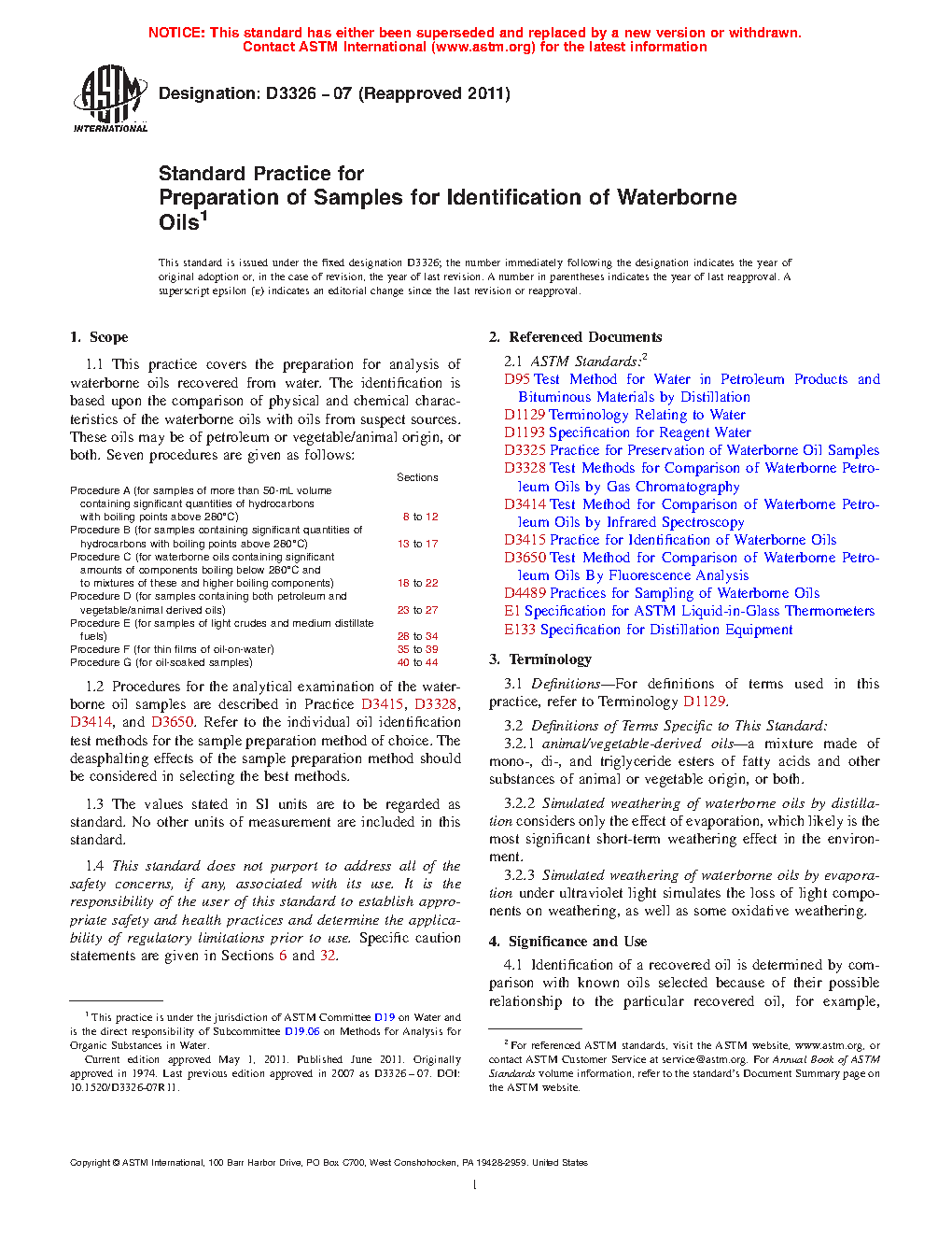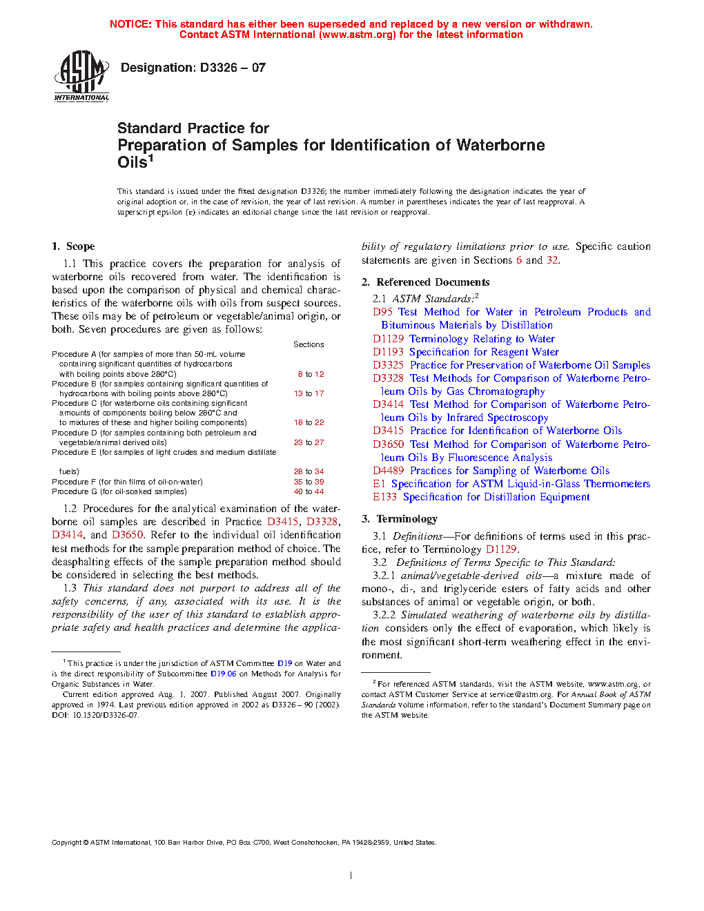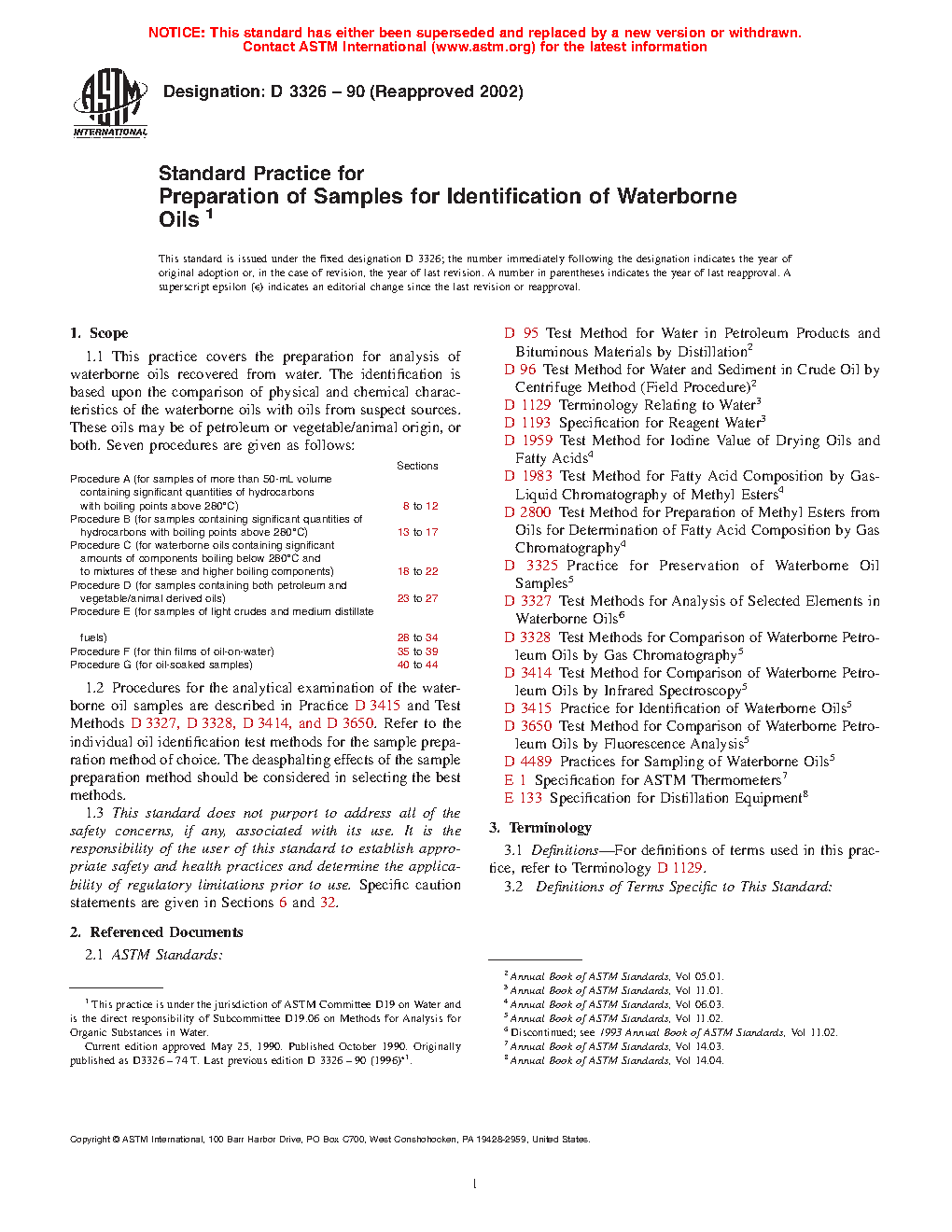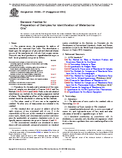1.2 Procedures for the analytical examination of the waterborne oil samples are described in Practice D 3415 and Test Methods D 3327, D 3328, D 3414, and D 3650. Refer to the individual oil identification test methods for the sample preparation method of choice. The deasphalting effects of the sample preparation method should be considered in selecting the best methods.