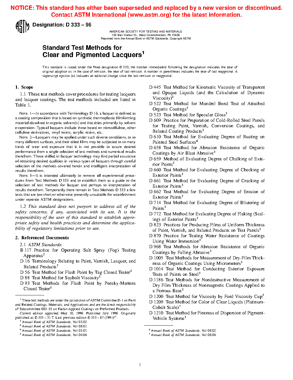 Note 3: It is intended ultimately to remove all experimental procedures from Test Methods D333 and to establish them as a guide to the selection of test methods for lacquer and perhaps to interpretation of results therefrom. Temporarily there remain in Test Methods D333 a few tests that are too short or otherwise presently unsuitable for establishment under separate ASTM designations.
