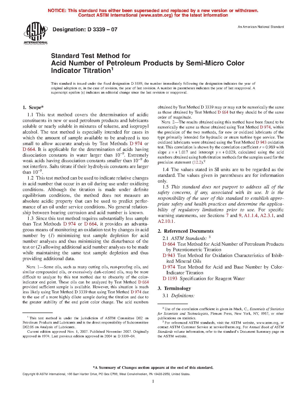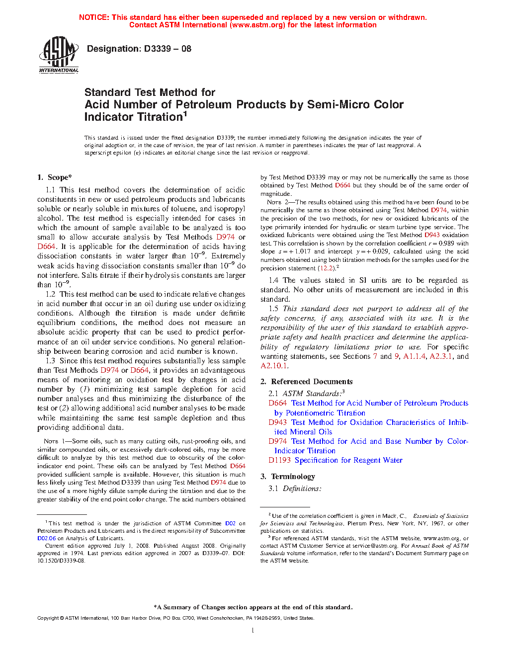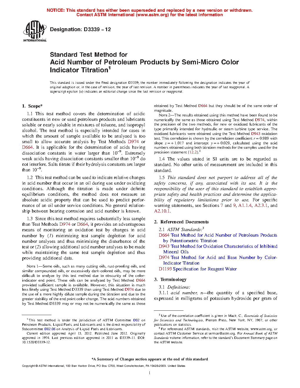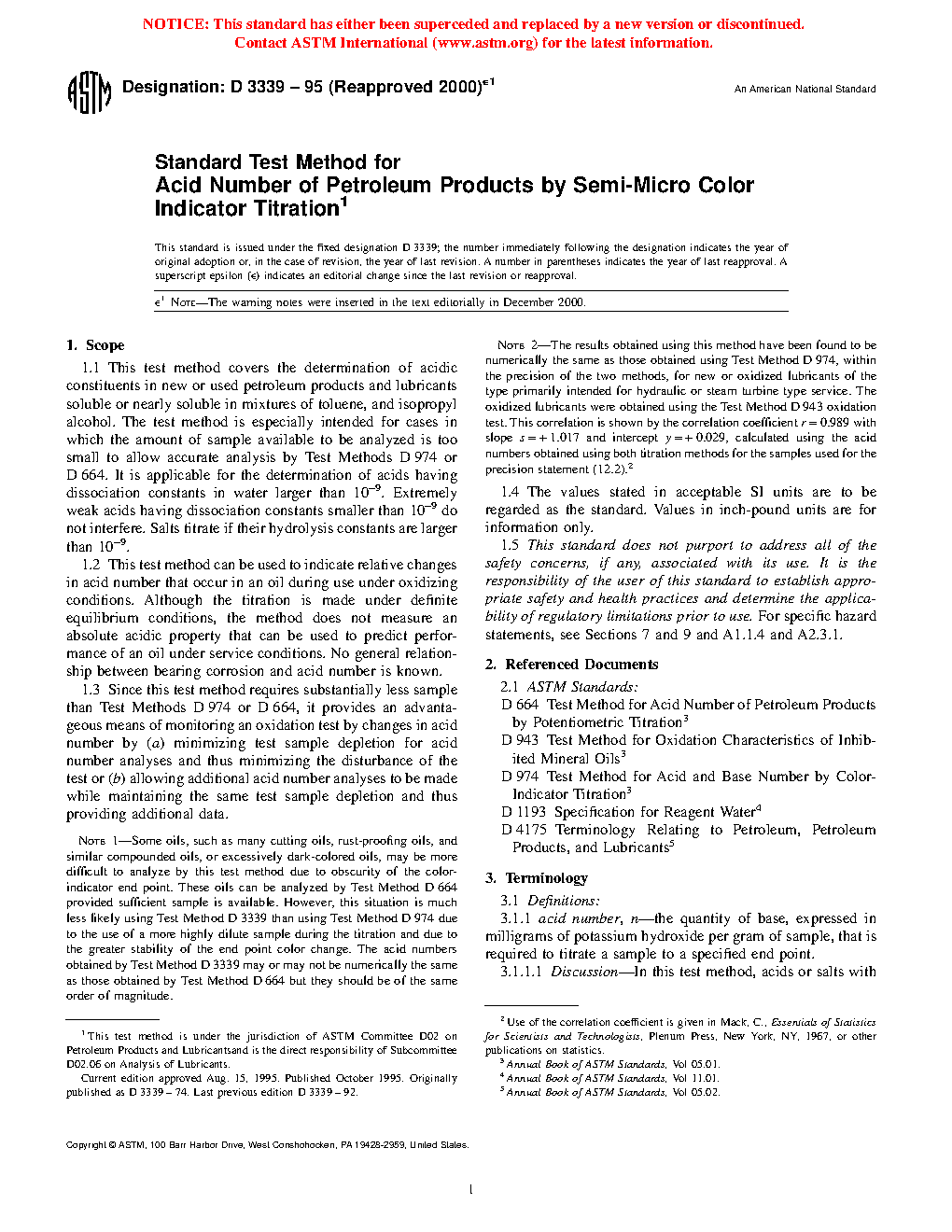 Note 2: The results obtained using this method have been found to be numerically the same as those obtained using Test Method D974, within the precision of the two methods, for new or oxidized lubricants of the type primarily intended for hydraulic or steam turbine type service. The oxidized lubricants were obtained using the Test Method D943 oxidation test. This correlation is shown by the correlation coefficient r = 0.989 with slope s = + 1.017 and intercept y = + 0.029, calculated using the acid numbers obtained using both titration methods for the samples used for the precision statement (12.2).2