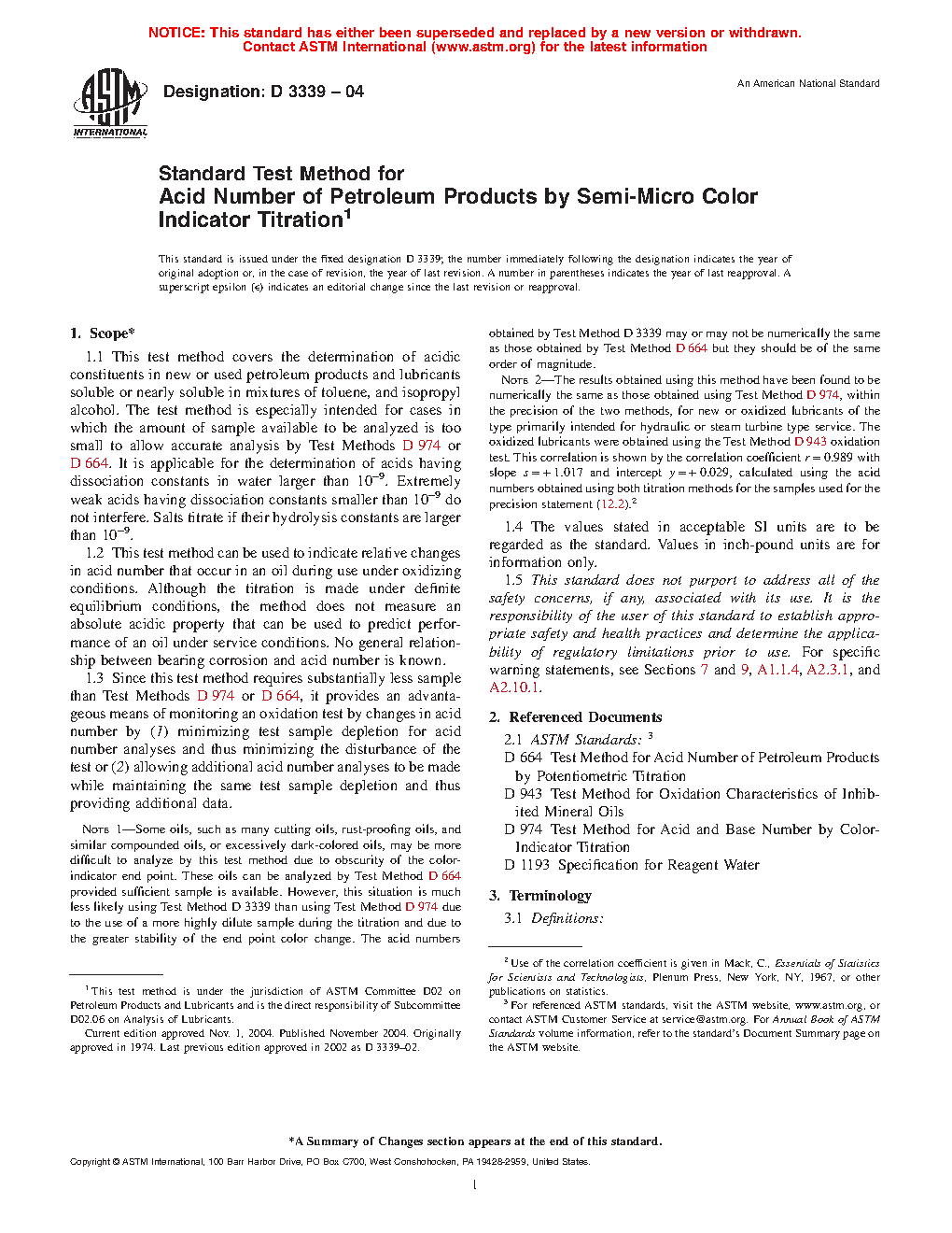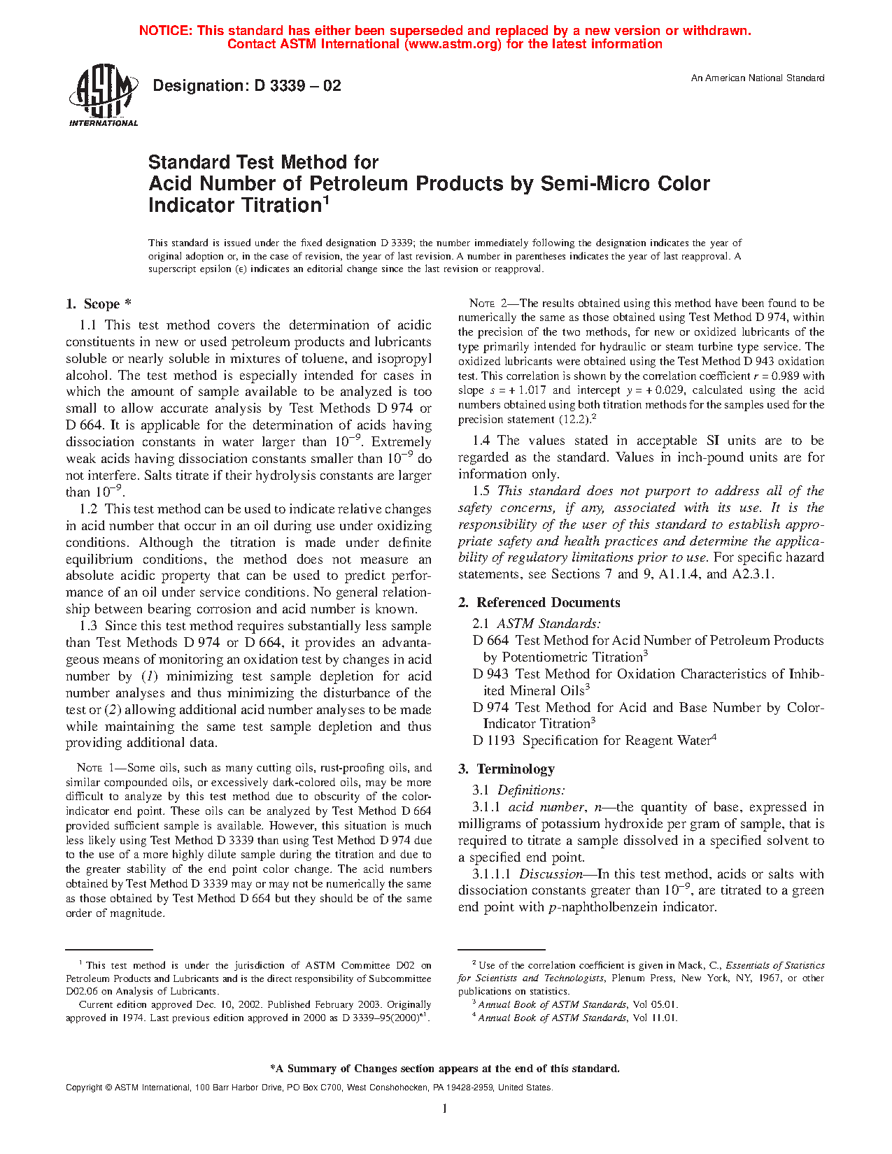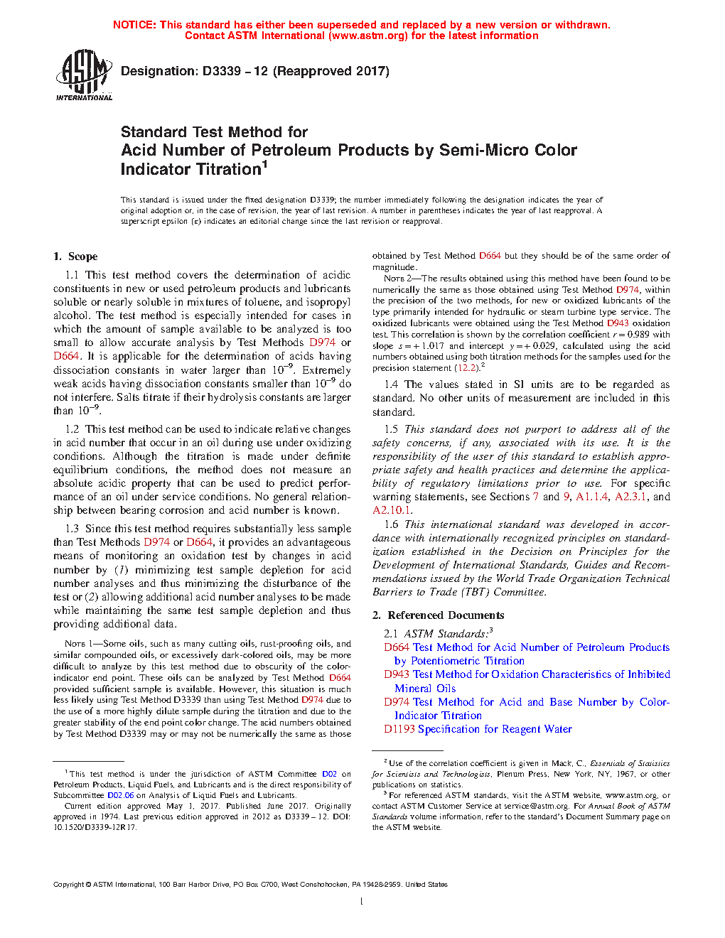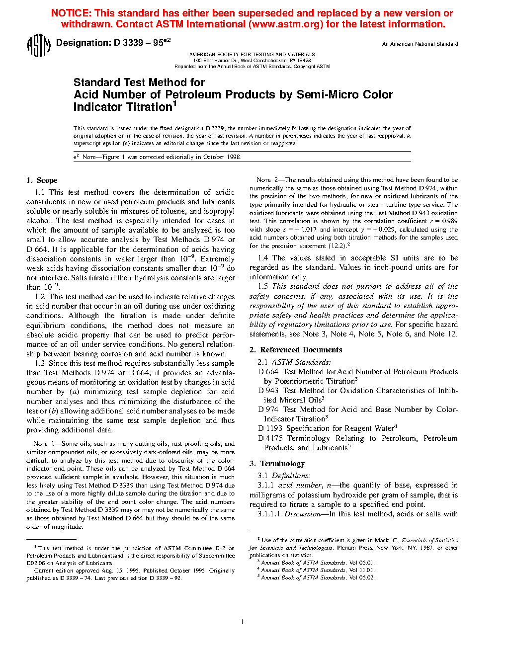 Note 2: The results obtained using this method have been found to be numerically the same as those obtained using Test Method D974, within the precision of the two methods, for new or oxidized lubricants of the type primarily intended for hydraulic or steam turbine type service. The oxidized lubricants were obtained using the Test Method D943 oxidation test. This correlation is shown by the correlation coefficient r = 0.989 with slope s = + 1.017 and intercept y = + 0.029, calculated using the acid numbers obtained using both titration methods for the samples used for the precision statement (12.2).2
