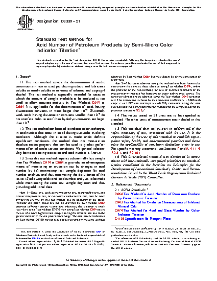 1.3 Since this test method requires substantially less sample than Test Methods D974 or D664, it provides an advantageous means of monitoring an oxidation test by changes in acid number by (1) minimizing test sample depletion for acid number analyses and thus minimizing the disturbance of the test or (2) allowing additional acid number analyses to be made while maintaining the same test sample depletion and thus providing additional data.