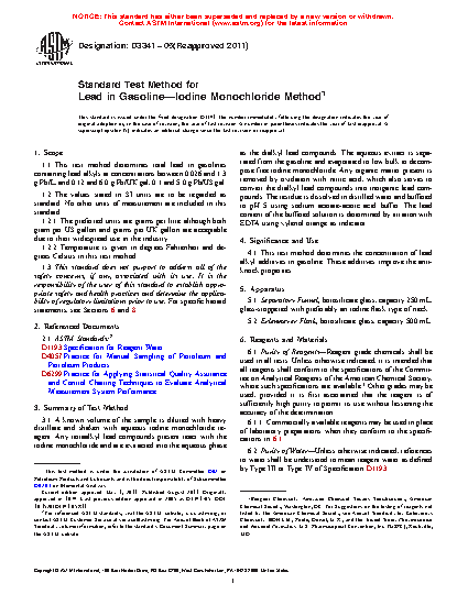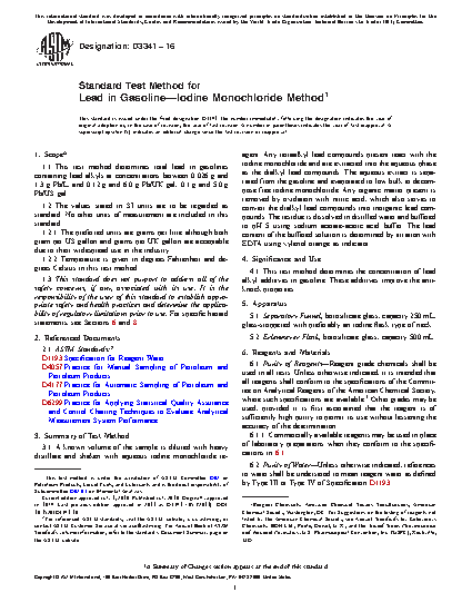 1.1 This test method determines total lead in gasolines containing lead alkyls at concentrations between 0.026 g and 1.3 g Pb/L, and 0.12 g and 6.0 g Pb/UK gal, 0.1 g and 5.0 g Pb/US gal.