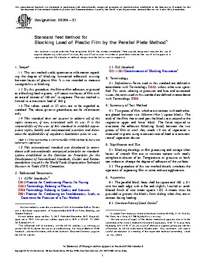 1.1 This test method yields quantitative information regarding the degree of blocking (unwanted adhesion) existing between layers of plastic film. It is not intended to measure susceptibility to blocking.