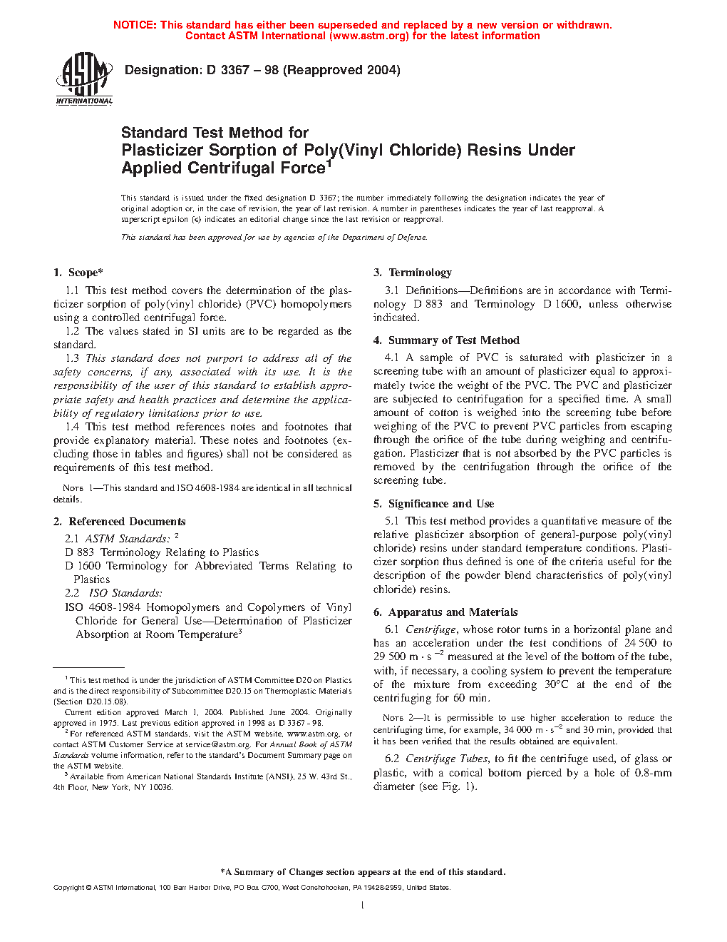 1.1 This test method covers the determination of the plasticizer sorption of poly(vinyl chloride) (PVC) homopolymers using a controlled centrifugal force.