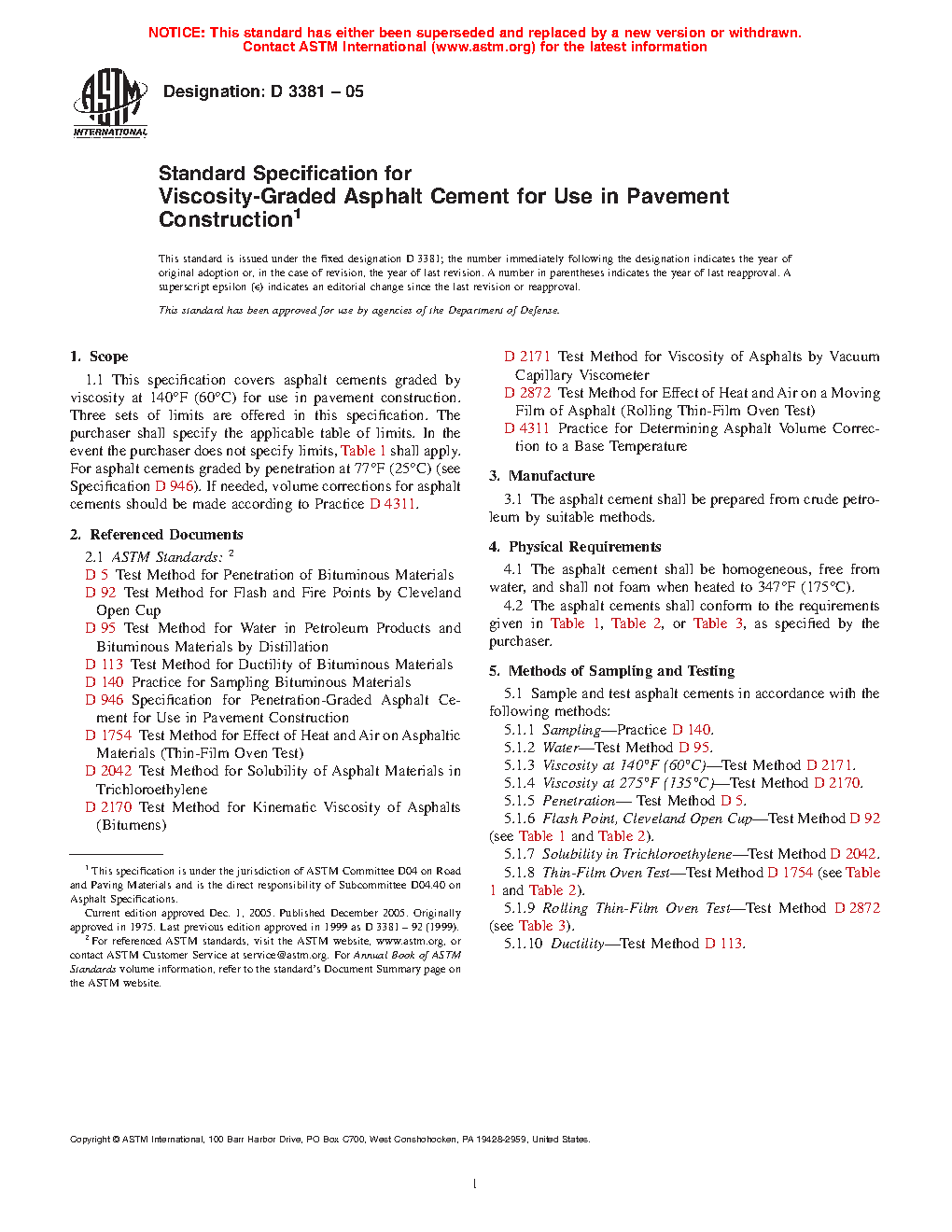 1.1 This specification covers asphalt cements graded by viscosity at 140°F (60°C) for use in pavement construction. Three sets of limits are offered in this specification. The purchaser shall specify the applicable table of limits. In the event the purchaser does not specify limits, Table 1 shall apply. For asphalt cements graded by penetration at 77°F (25°C) (see Specification D946). If needed, volume corrections for asphalt cements should be made according to Practice D4311.