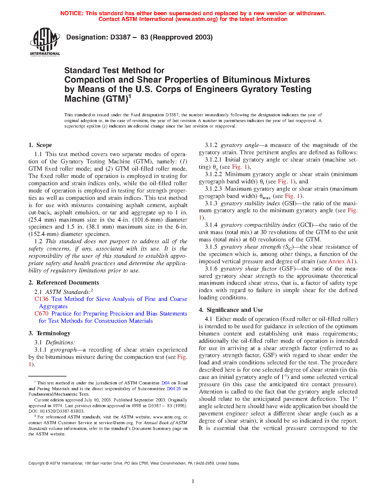 1.1 This method employs a testing machine (Fig. 1) that generates a precisely controlled gyratory kneading process which is used to prepare and test specimens of bituminous paving mixtures. This method is intended for use in bituminous mixtures design and control testing as well as accelerated traffic simulation. The objective is to compact to the ultimate in place density under the anticipated vertical stress while monitoring the process in terms of unit mass, and shearing resistance including the plastic properties. Particular attention is given to the development of the plastic properties associated with the compaction phenomenon. The maximum permissible bitumen content is indicated directly by the first evidence of a progressive increase in shear strain (as indicated by a progressive increase in the gyratory angle) accompanied by a progressive reduction in shear strength (as indicated by a progressive reduction in roller pressure.) The procedures described here are for mix design and plant control as well as accelerated traffic simulation.